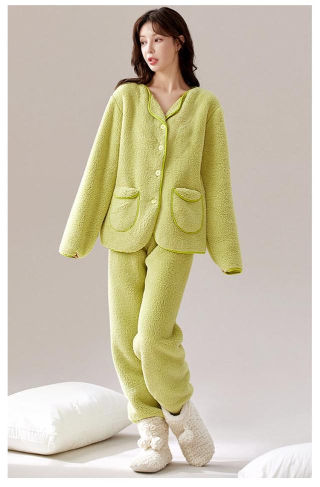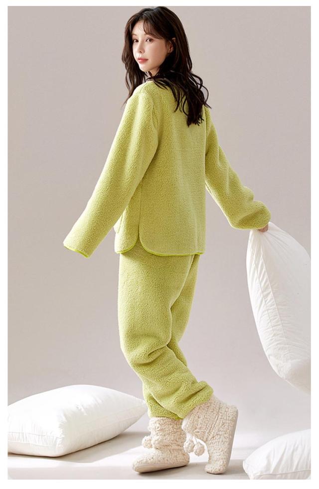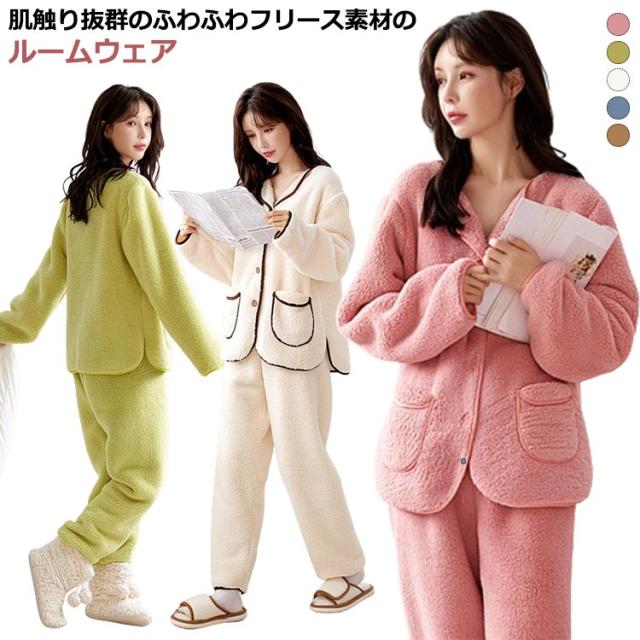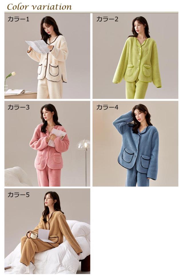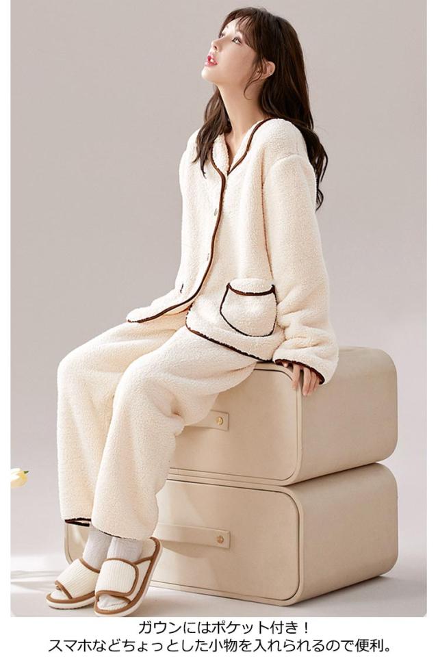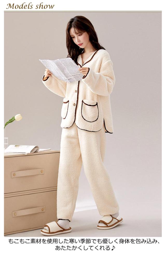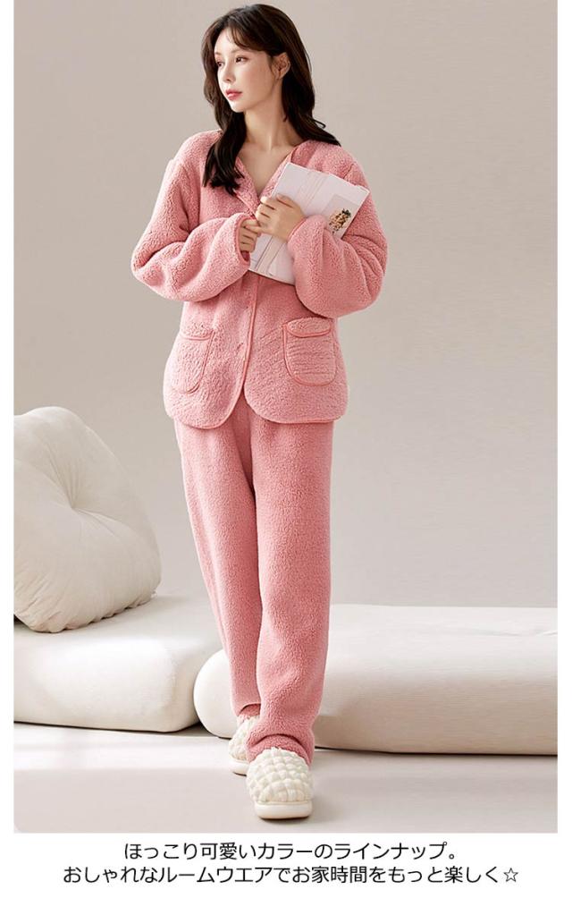パジャマ レディース ふわふわ 上下セット 前開き パンツ 冬 もこもこ フランネル ルームウェア 長袖 長ズボン 2点セット セットアップ 厚手 暖かい 部屋着 ナイトウェア ナイトガウン 寝巻き かわいい おしゃれ