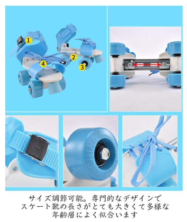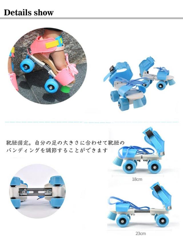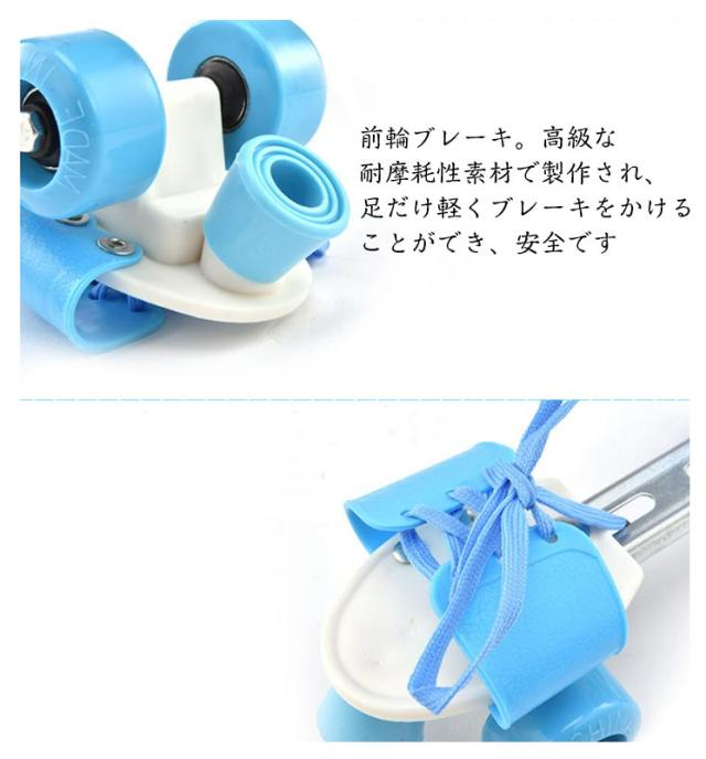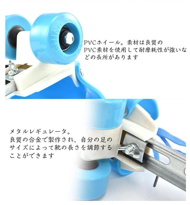 | いつも履いている靴でOK。簡単脱着式。靴を選ばず、お子様の成長に合わせてご使用いただけます サイズ調節可能。専門的なデザインでスケート靴の長さがとても大きくて多様な年齢層によく似合います 靴紐固定。自分の足の大きさに合わせて靴紐のバンディングを調節することができます 前輪ブレーキ。高級な耐摩耗性素材で製作され、足だけ軽くブレーキをかけることができ、安全です PVCホイール。素材は良質のPVC素材を使用して耐摩耗性が強いなどの長所があります メタルレギュレータ。良質の合金で製作され、自分の足のサイズによって靴の長さを調節することができます | |