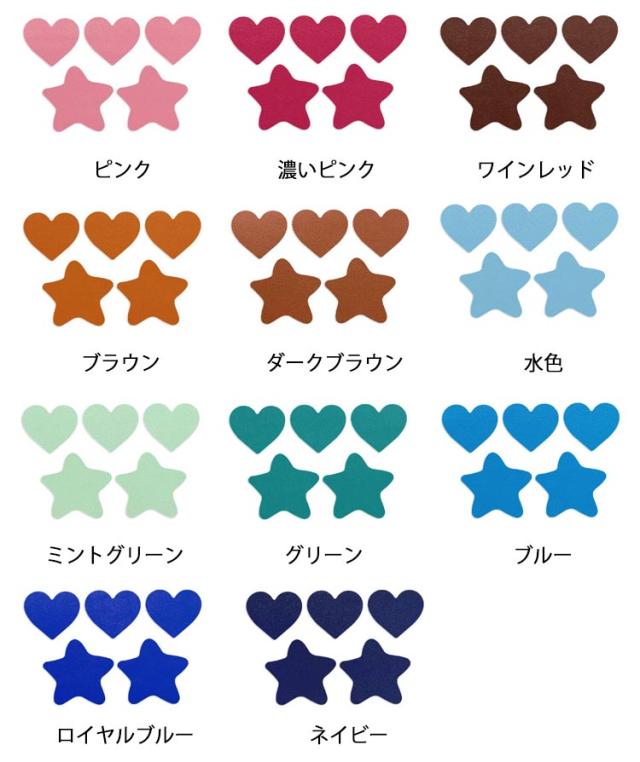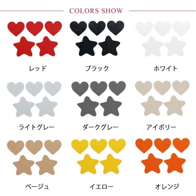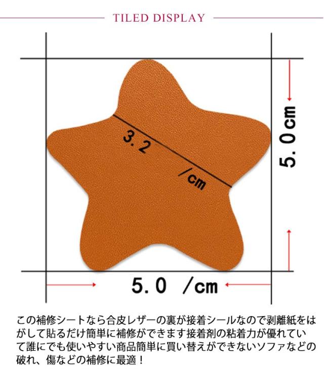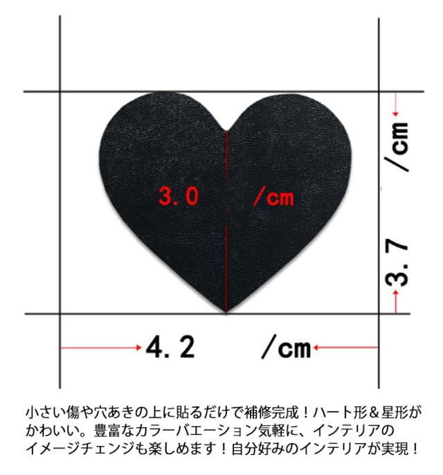 | ハート形&星形の貼るタイプPUレザー生地。【全20色】【10枚セット】 この補修シートなら合皮レザーの裏が接着シールなので剥離紙をはがして貼るだけ簡単に補修ができます接着剤の粘着力が優れていて誰にでも使いやすい商品簡単に買い替えができないソファなどの破れ、傷などの補修に最適! 小さい傷や穴あきの上に貼るだけで補修完成!ハート形&星形がかわいい。 豊富なカラーバエーション気軽に、インテリアのイメージチェンジも楽しめます!自分好みのインテリアが実現! 【用途】:補修シールとして自転車のサドル・車のシート・バイクのシート・ソファーのシートなどの修理、修補、破れ隠し用。化粧箱、ギフトケースなどに貼るにも最適です。 補修シールとして使い方について:※ 補修の貼りは簡単で素人でも完璧に仕上がります。Step1:補修及び改装を必要とする個所を確認します。Step2:必要とする個所を綺麗に拭き取って乾かしてください。Step3:剥離紙をゆっくりはがしながら貼りたい部分に密着させていただき、生地の表面が盛り上がったり隙間ができることのないように貼り付けてください。★貼り付けてから、できるだけ24時間そのまま放置してください、24時間後はしっかり接着しております。 | |