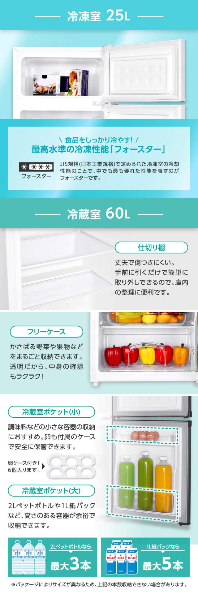 - 2〜3日分を購入保存が出来ます。 ドアポケットに飲料や調味料なども収納して使用しています。 たまごケースも付いていたり、霜取り道具も付いているのは便利です。 今までは、お気に入りの調理器具です。