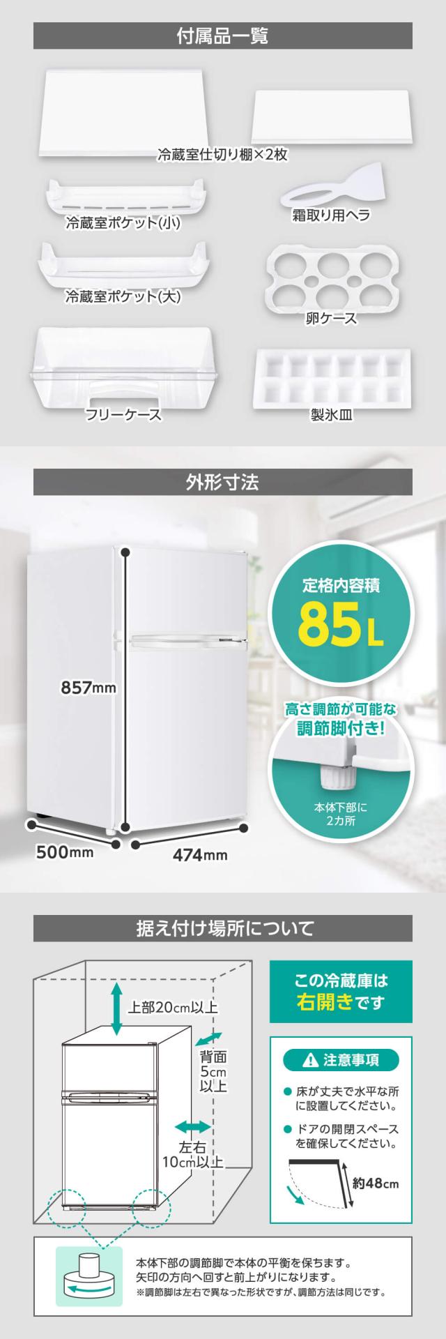 冷蔵庫 85L コンパクト 大容量 右開き 2ドア 幅48cm 一人暮らし 冷凍室上側 温度調節 静音 耐熱板 省スペース 黒 グレー JR085HM01 マクスゼン
