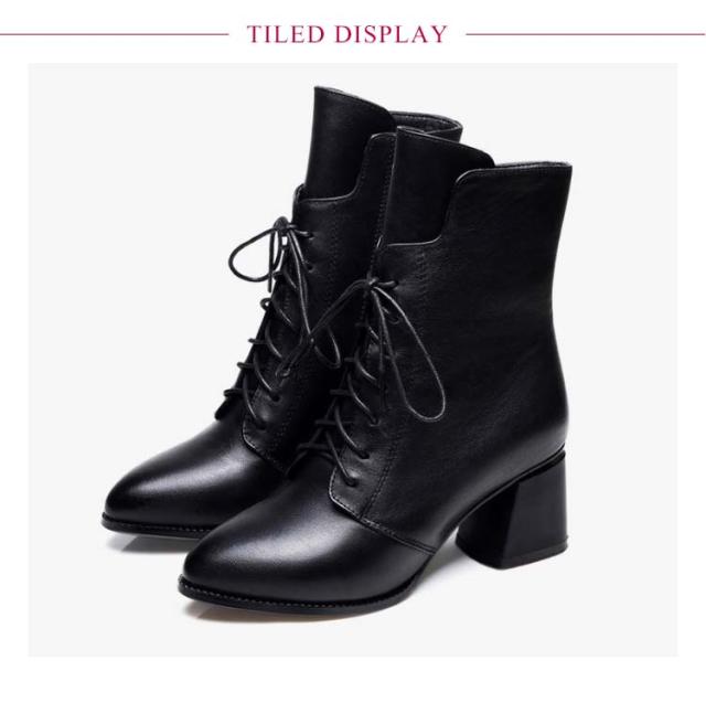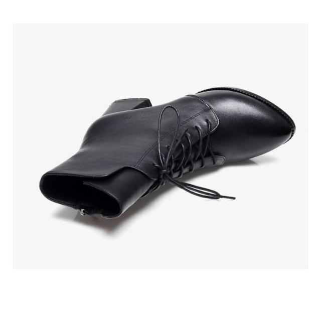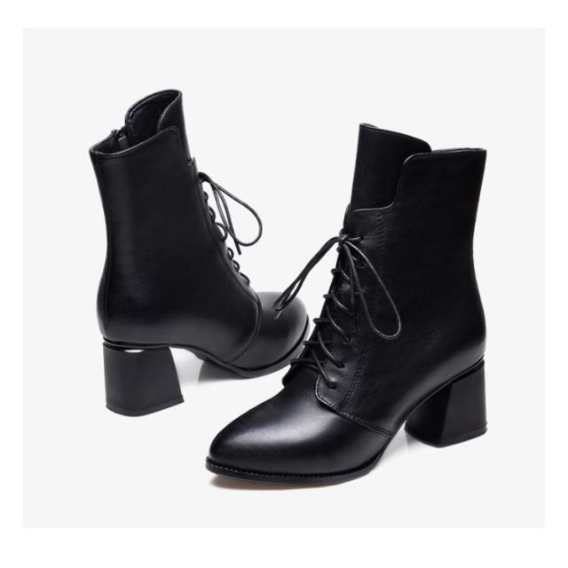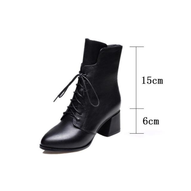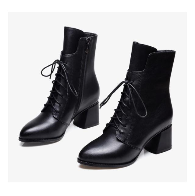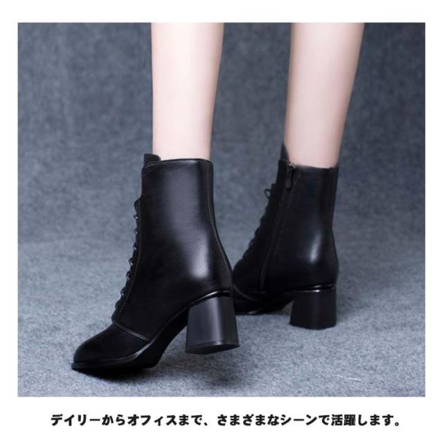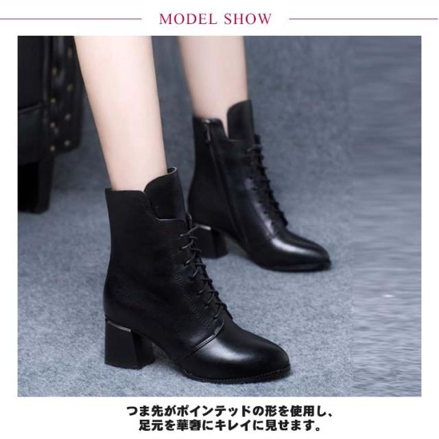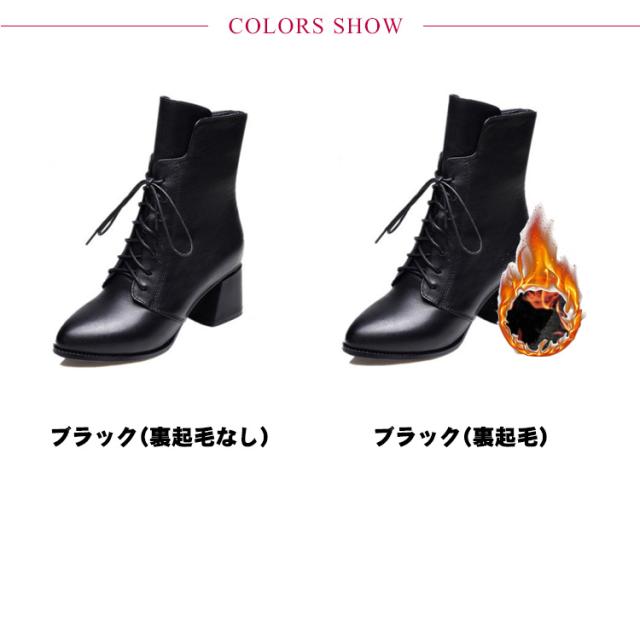 ポインテッドトゥ ショートブーツ レースアップ 秋冬 防寒 ブーツ 6cmヒール 編上げ レディース チャンキーヒール サイドジップ ファスナー 太ヒール 6cmヒール ブーツ 裏起毛 暖かい 歩きやすい 履きやすい 黒 大人 カジュアル