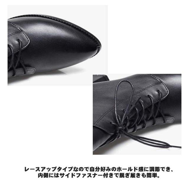 | とがったつま先デザインでスタイリッシュな印象のレースアップブーツ。 つま先がポインテッドの形を使用し、足元を華奢にキレイに見せます。 ブーツ丈も長すぎずに合わせやすく、存在感のある絶妙なシルエットを制作。 裏起毛素材を使用しているので暖かくさせてくれるのも魅力です。(裏起毛なしタイプもあり) レースアップタイプなので自分好みのホールド感に調節でき、内側にはサイドファスナー付きで脱ぎ履きも簡単。 デイリーからオフィスまで、さまざまなシーンで活躍します。 | |