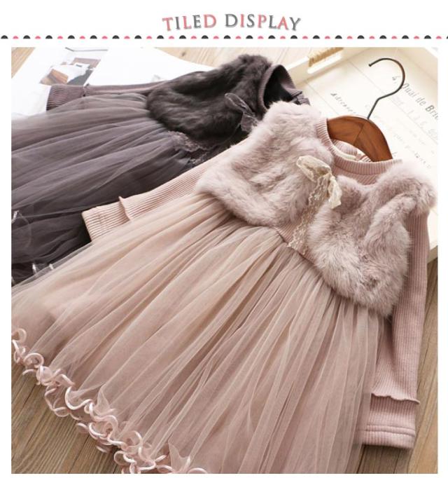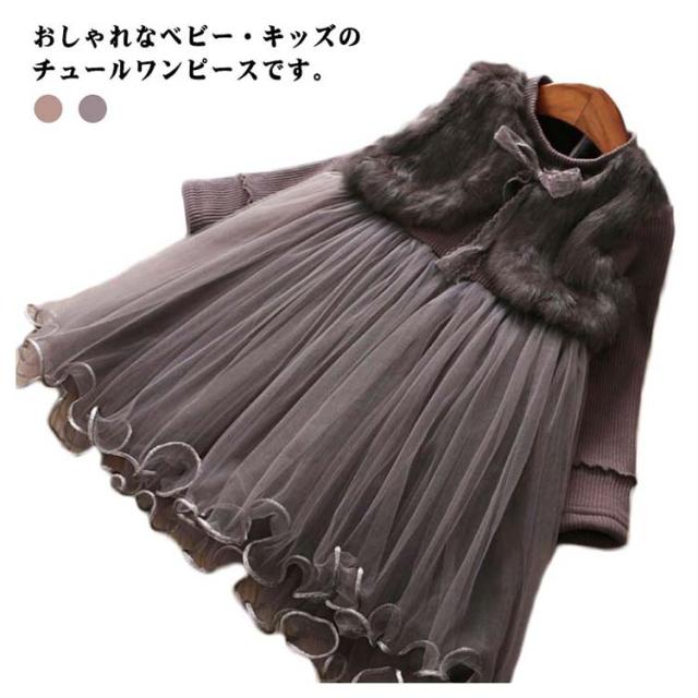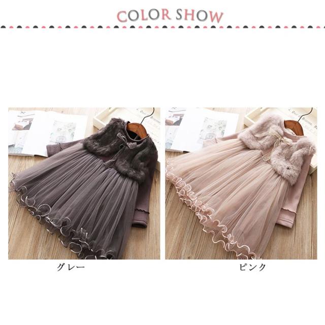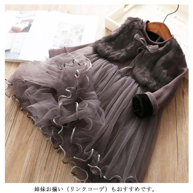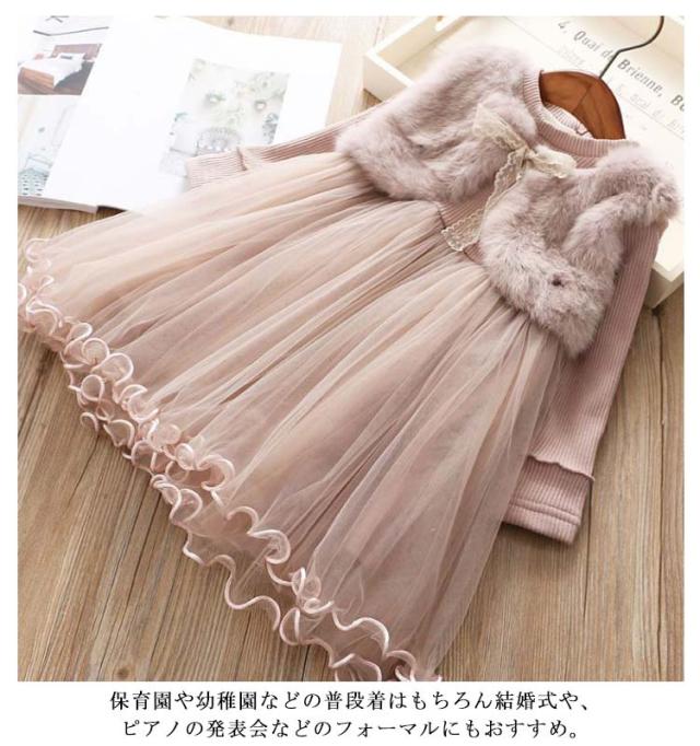 チュール チュチュ ワンピース フェイクファードッキング ドレス チュール 裏起毛 子供服 パーティー 結婚式 長袖 暖かい 90 100 110 120 130