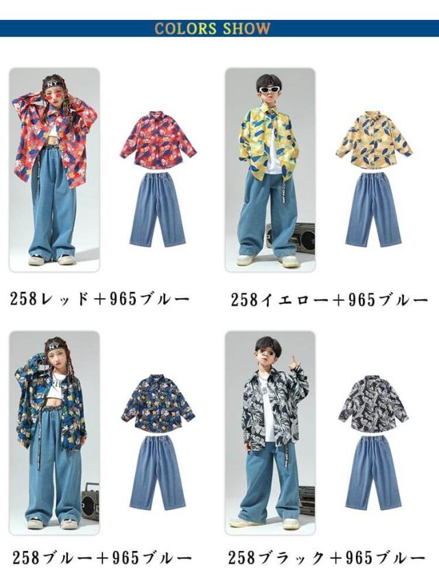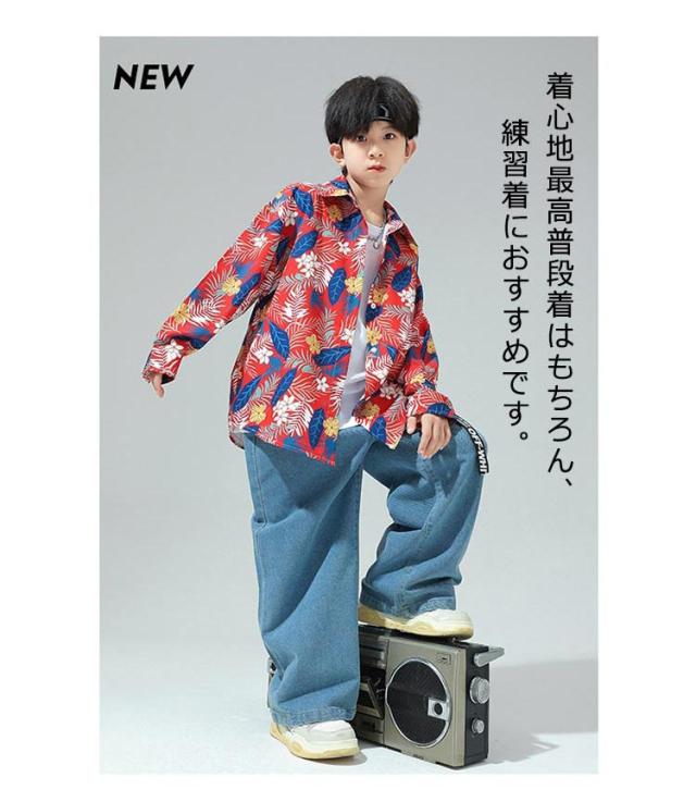 柄シャツ デニムパンツ キッズダンス衣装 シャツ カラフル 男の子 女の子 セットアップ 2点 韓国 子供服 トップス キッズダンス 衣装 ゆるシャツ ヒップホップ 子ども服 体型カバー 舞台 演出服 イベント ダンス衣装 送料無料 ギフト