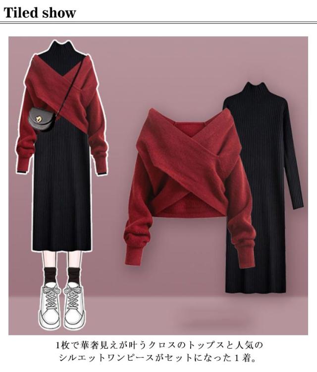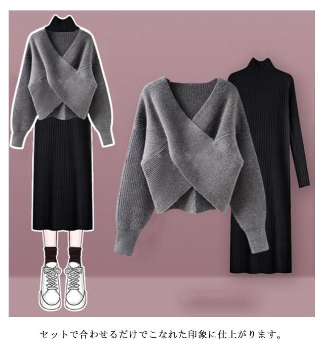 クロスニットニットワンピース 上下セット セットアップ レディース 長袖 可愛い セーター タートルネック マキシ丈 トップス ロング丈 フェミニン 女性 通勤 通学 カジュアル きれいめ 秋冬 無地 全4色 体型カバー 着?せ 大きいサイズ プレゼント ギフト 送料無料
