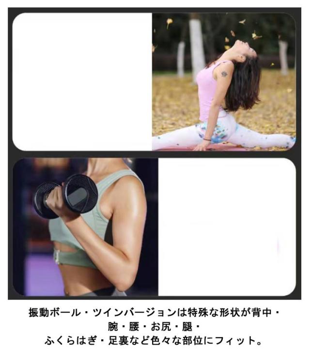 | 【振動ボール】【3段階振動調整】 振動ボール・ツインバージョンは特殊な形状が背中・腕・腰・お尻・腿・ふくらはぎ・足裏など色々な部位にフィット。 充電式コードレスなので手の届かない部位も利用可能。また、オフィスなどにも持ち運び自由。 【使い方】 エクササイズ フィットネス ダイエット トレーニング ストレッチ 体幹運動 腹筋 筋トレ などに。 | |