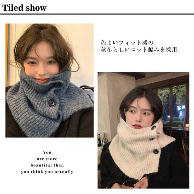 | 着脱ラクラク♪ボタン付きネックウォーマー 程よいフィット感の秋冬らしいニット編みを採用。 ボタンが付いているので、着脱もラクラク♪ 絶妙なバランスやボリューム感にこだわり、ややハリを感じる着用感に仕上げました。 | |