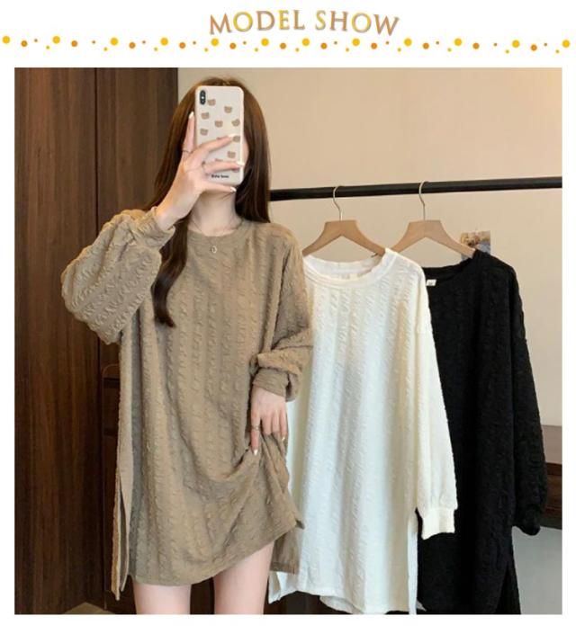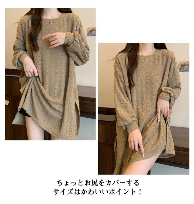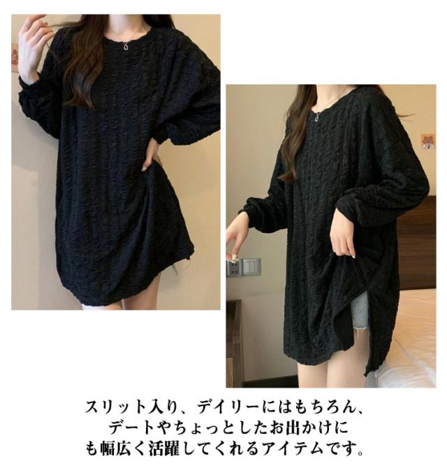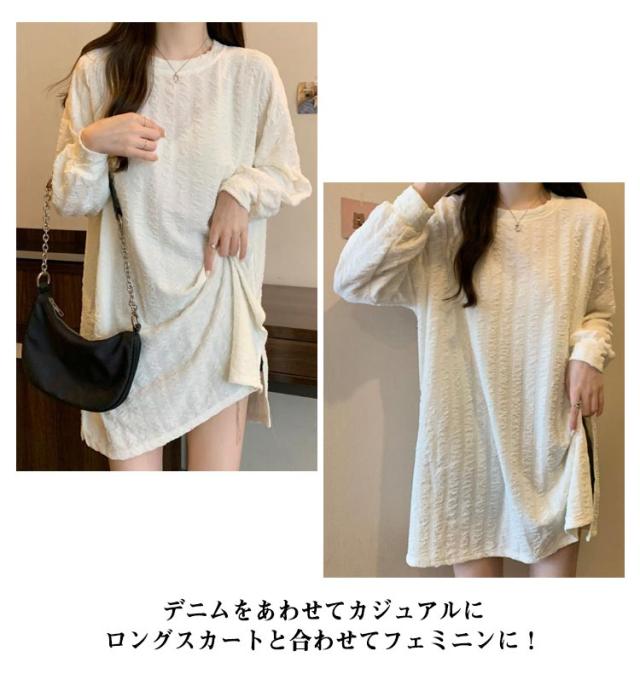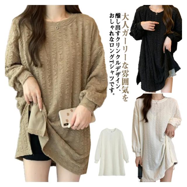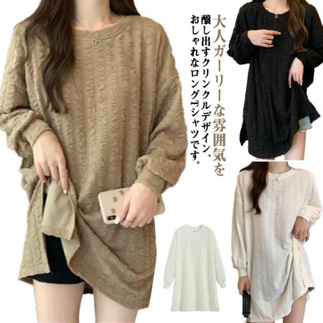 | 大人ガーリーな雰囲気を醸し出すクリンクルデザイン、おしゃれなロングTシャツです。 ちょっとお尻をカバーするサイズはかわいいポイント! デニムをあわせてカジュアルにロングスカートと合わせてフェミニンに! スリット入り、デイリーにはもちろん、デートやちょっとしたお出かけにも幅広く活躍してくれるアイテムです。 | |