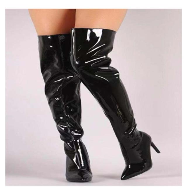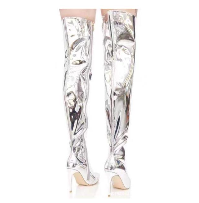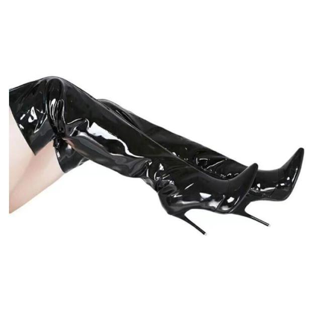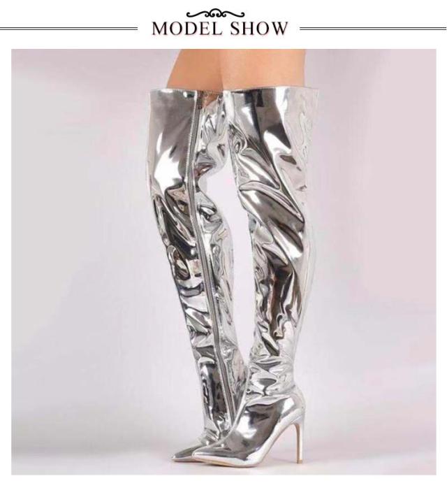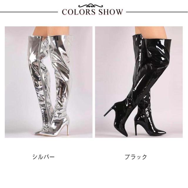 ロング ハイヒール ライブ エナメル レディース コスプレ靴 セクシー オーバーニーブーツ ポインテッドトゥ 仮装 イベント 舞台 パーティー ニーハイブーツ 衣装 細見え 8cmヒール ジッパー