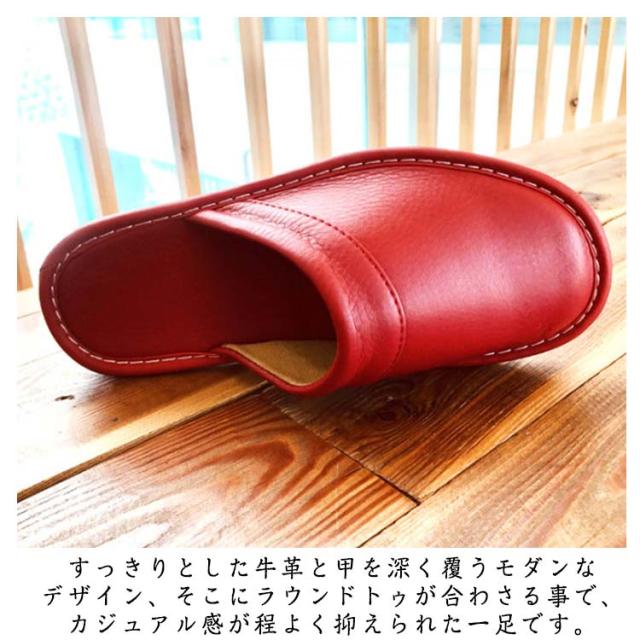 | 上質な天然皮革を使ったスリッパ すっきりとした牛革と甲を深く覆うモダンなデザイン、そこにラウンドトゥが合わさる事で、カジュアル感が程よく抑えられた一足です。 裏底の滑り止めで転倒のリスクを軽減します。 季節を問わずに使えるので、来客用としてもおすすめです。 高級感あふれる一足は、自宅はもちろん、スリッパを利用するオフィスなどにもおすすめです。 | |