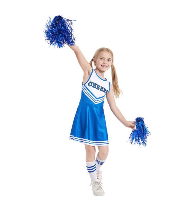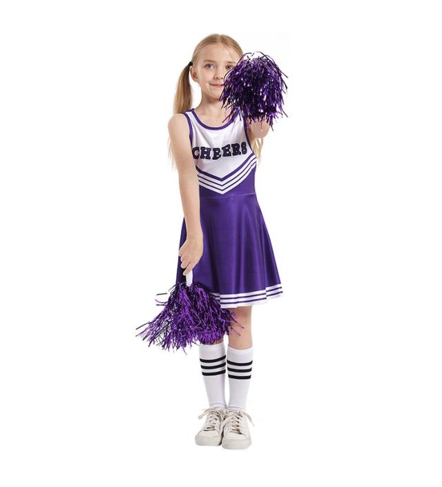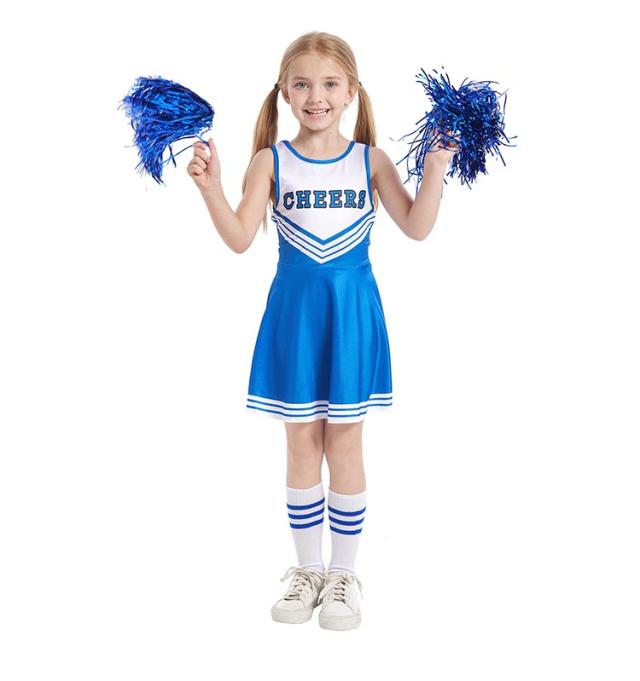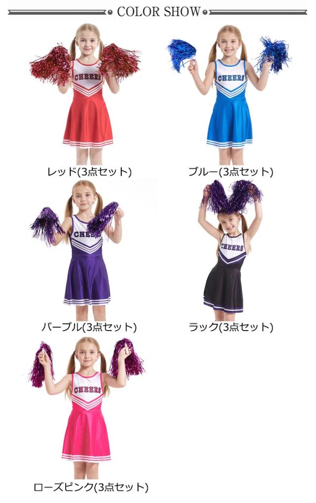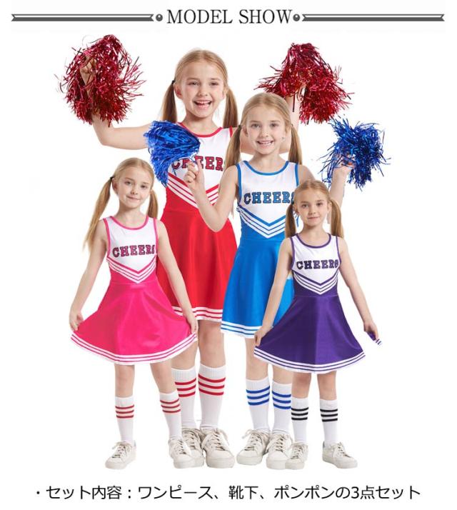 衣装 女の子 キッズ チアガール 3点セット ワンピース チアポンポン付き 靴下付き ノースリーブ 野球 応援 文化祭 学園祭 スポーツ