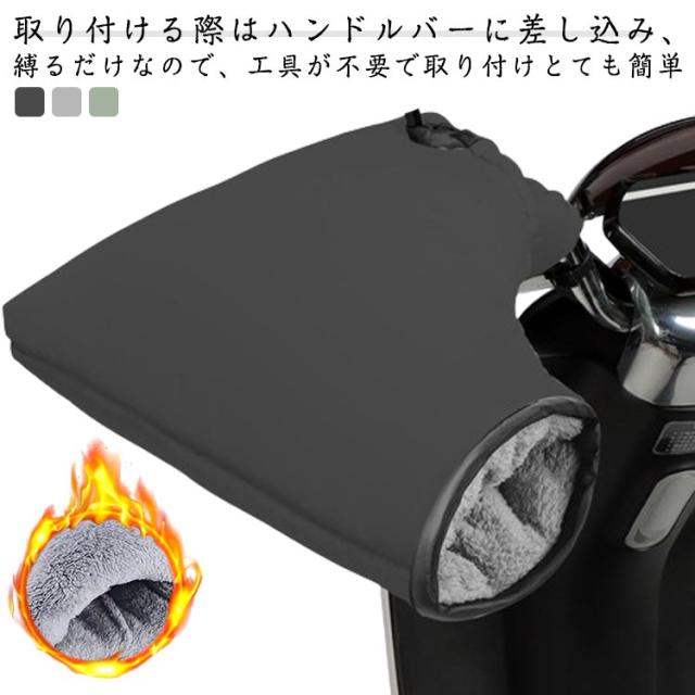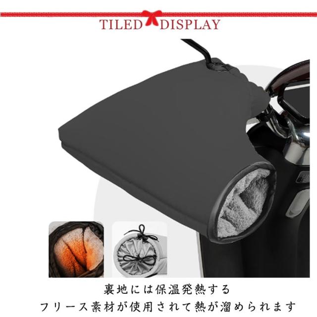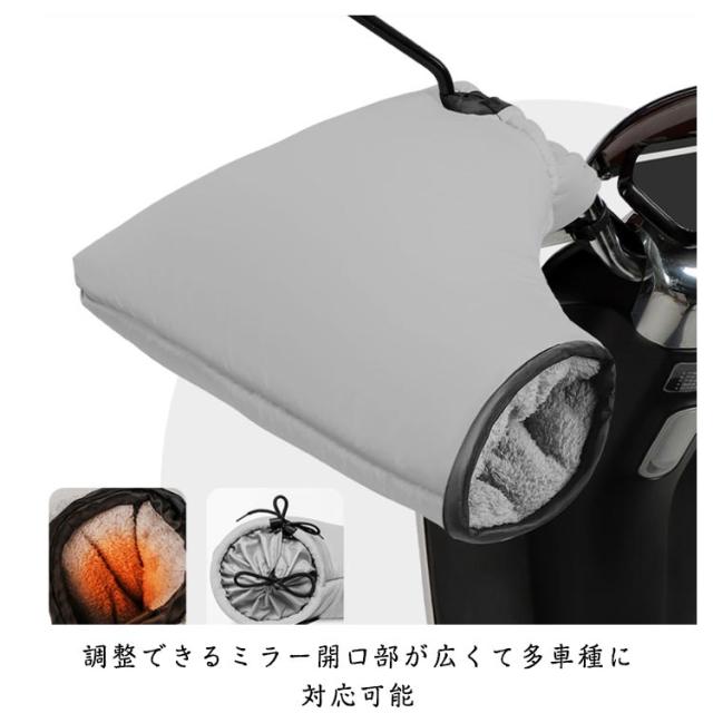 | 取り付ける際はハンドルバーに差し込み、縛るだけなので、工具が不要で取り付けとても簡単 表面に高い防水性能を持つ素材を採用して急な雨が降りしてもバイク乗りの手も乾燥と快適さがキープできる 調整できるミラー開口部が広くて多車種に対応可能 手首開口部が大きく、手の抜き差しに支障が少なくなっている 裏地には保温発熱するフリース素材が使用されて熱が溜められます | |