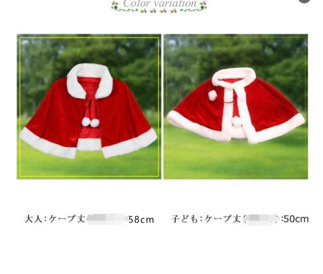 | 気軽に着られる可愛いケープ。 大人から子供まで幅広く使っていただけます。 おしゃれな一品でクリスマスプレゼントとしてもよろしいです。 このクリスマスコスチュームケープは、羽織るだけでクリスマス気分にさせてくれます。 クリスマスコスチュームとしてはもちろん、文化祭や学園祭、忘年会、宴会、パーティーなどのイベント衣装としてもお使いいただけます。 | |