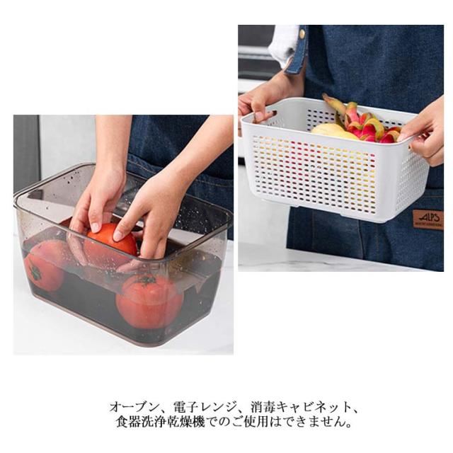| 通気性をアップ 通気性を良くし、側面や底面の水分に触れるのを防いで腐敗を妨げるバスケット。ハンドル付きで取り出しやすく、水切り用のバスケットとしても使用可能。 湿気をコントロール フタ中央の通気孔は開閉を調節でき、食材にあわせて適した湿度をキープ。裏面には食材ごとの開閉の設定がイラストで記載されており一目瞭然。 オーブン、電子レンジ、消毒キャビネット、食器洗浄乾燥機でのご使用はできません。 | |
