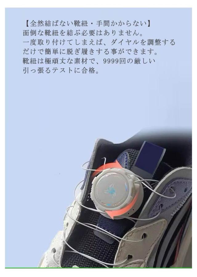 | 【結ばない、ほどない】日常でふと気づくと靴紐がほどけている。そのような経験はありませんか?そんな不満や経験をする事なくスムーズに履ける。それが「ダイヤル式の結ばない靴紐」です。 【全然結ばない靴紐・手間かからない】面倒な靴紐を結ぶ必要はありません。一度取り付けてしまえば、ダイヤルを調整するだけで簡単に脱ぎ履きする事ができます。靴紐は極頑丈な素材で、9999回の厳しい引っ張るテストに合格。 【脱ぎ履き簡単♪ダイヤル式の靴紐】ダイヤル式でロックする事で急にほどける心配がありません。また、ダイヤルを回すことで着用感を調整する事ができます。 【汎用性抜群!誰でもおしゃれに着用】現代感溢れるおしゃれなデザイン、お気に入りの一足に。ゴルフシューズ、スニーカー、ランニングシューズなどあらゆる靴に取り付けが可能です。 【キッズ子供・大人兼用】大人の靴はもちろん、靴紐の長さを調整するだけで、お子様の靴にもご使用頂けます。お年寄りや介護が必要な方にも是非お勧めのダイヤル式 結ばない 靴紐。 | |