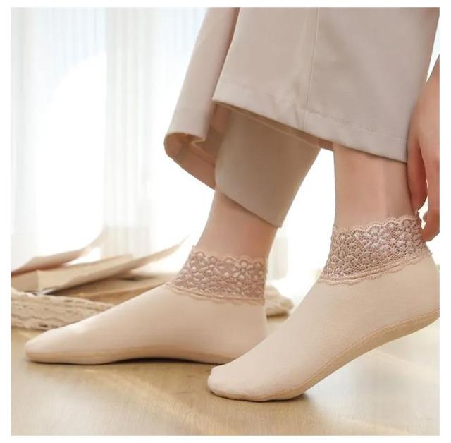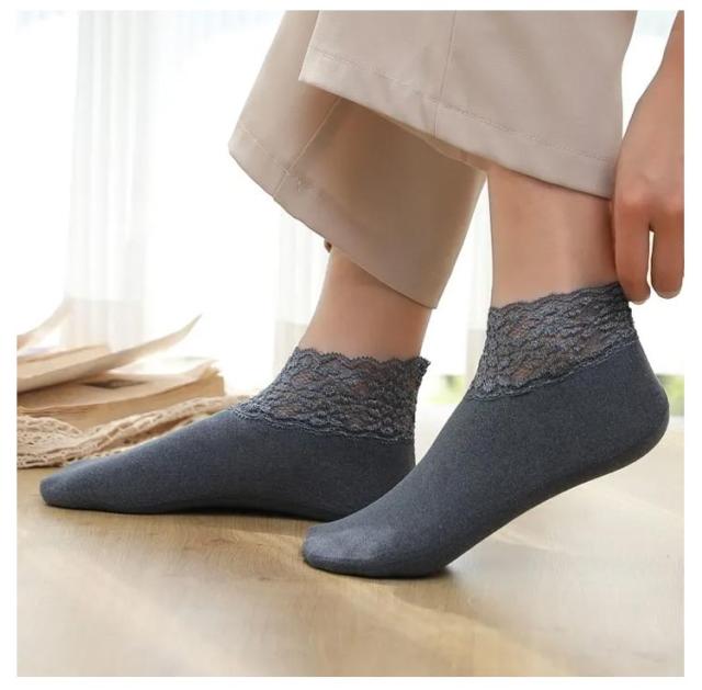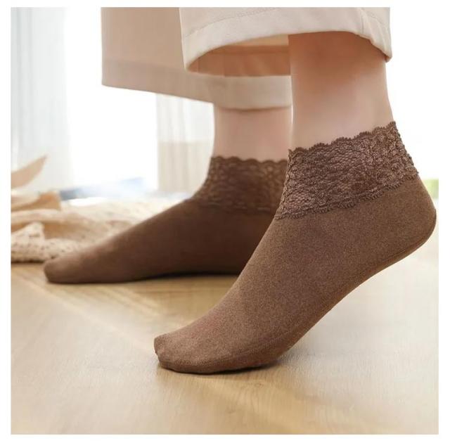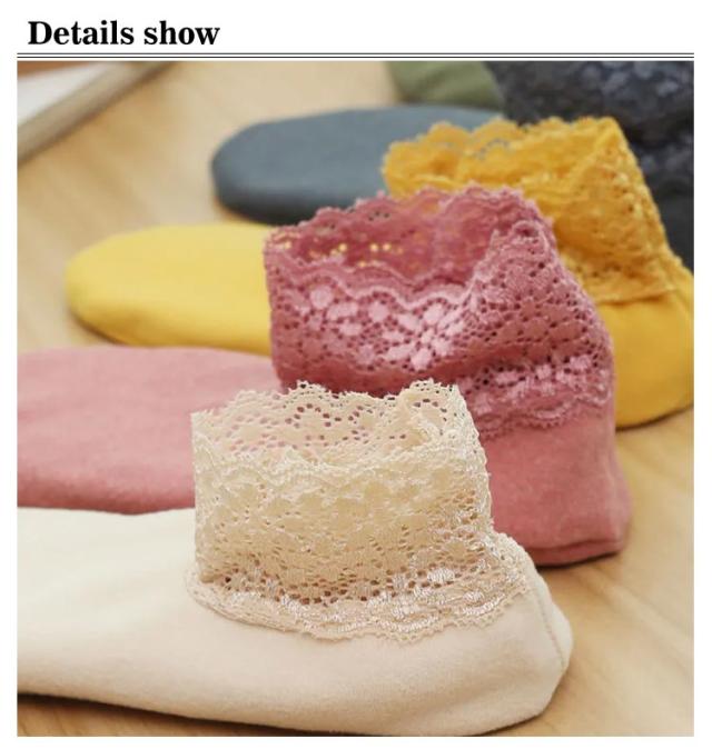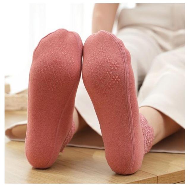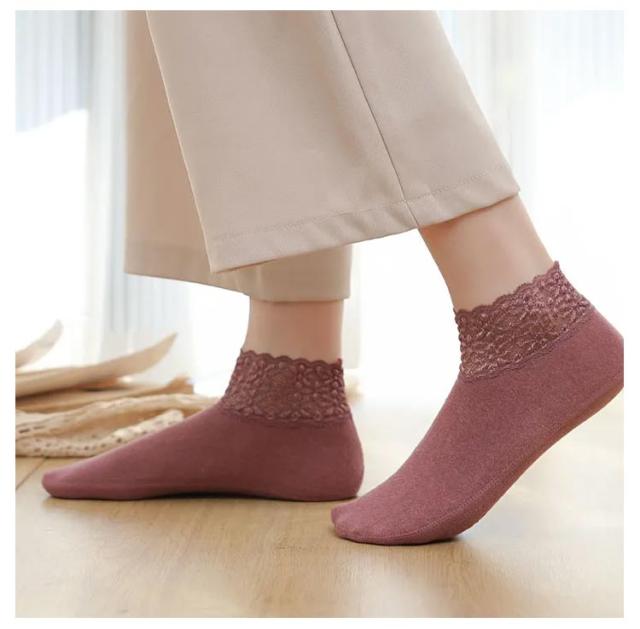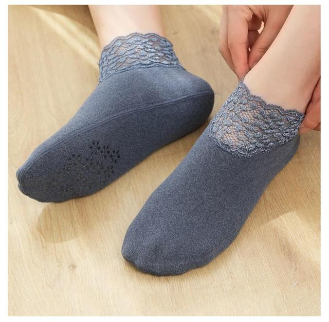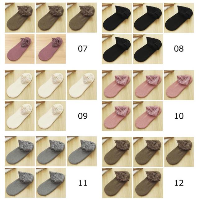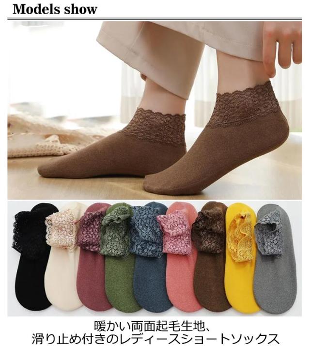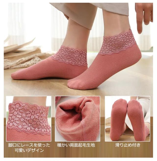 | 5足セット 暖かい両面起毛生地、滑り止め付きのレディースショートソックス 脚口にレースを使った可愛いデザイン | |