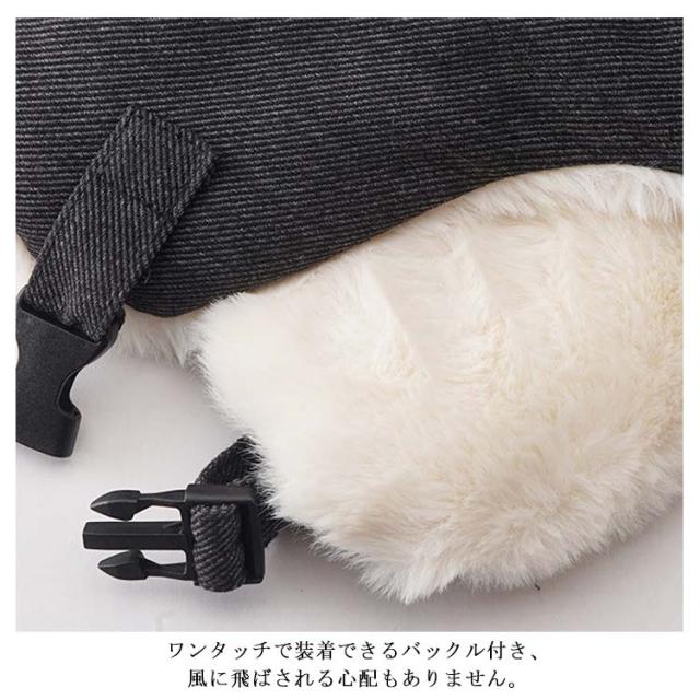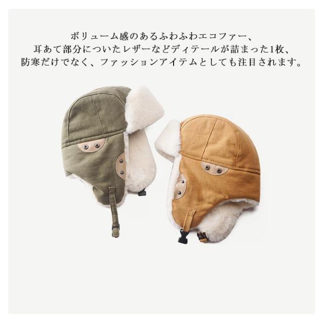 | 暖かくて心地よいフライトキャップ。 ワンタッチで装着できるバックル付き、風に飛ばされる心配もありません。 ボリューム感のあるふわふわエコファー、耳あて部分についたレザーなどディテールが詰まった1枚、防寒だけでなく、ファッションアイテムとしても注目されます。 耳あて部分を下ろせば、冷たくなりがちの耳の先や首もあったか、防寒にバッチリ。 裏地はキルティング加工で、ワンランク上の防寒力。 秋冬のファッションアイテムとしたり、寒い日のお出かけや通学・通勤、冬のスポーツ観戦など欠かせないアイテム。 | |