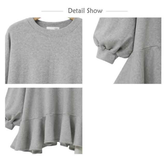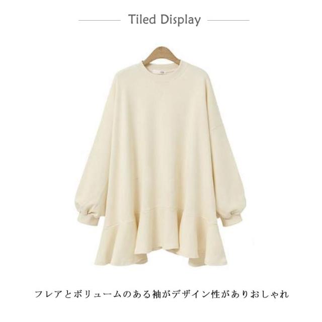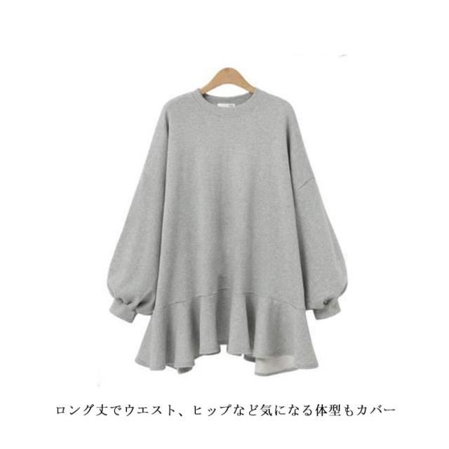 | 着まわし抜群のロングトレーナーです フレアとボリュームのある袖がデザイン性がありおしゃれ ロング丈でウエスト、ヒップなど気になる体型もカバー 生地は普通(裏起毛ではございません) | |
