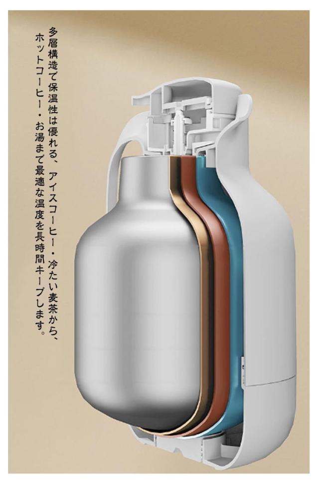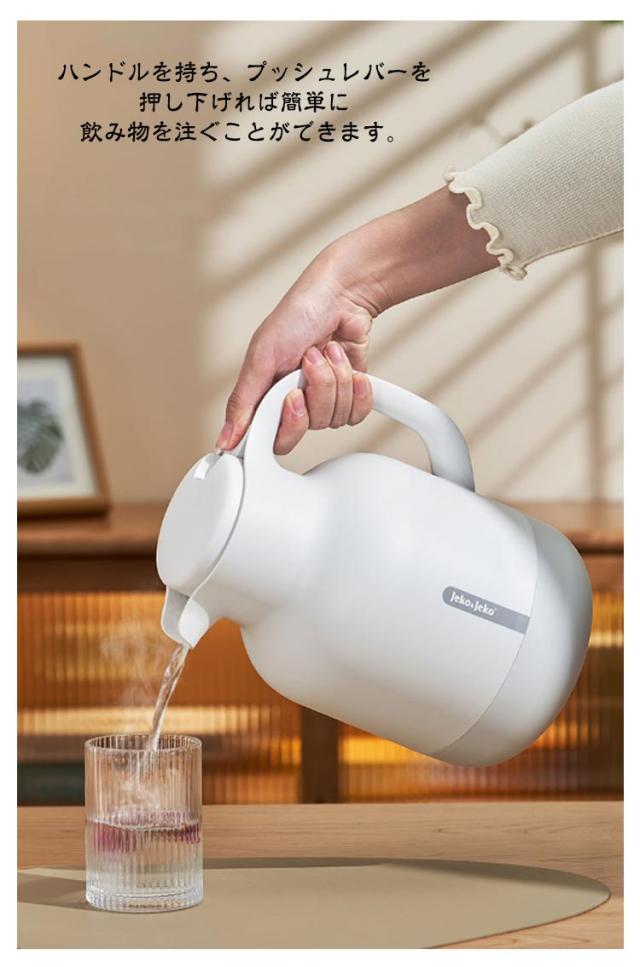 | 沢山飲み物が楽しめる大容量魔法瓶 ハンドルを持ち、プッシュレバーを押し下げれば簡単に飲み物を注ぐことができます。 多層構造で保温性は優れる、アイスコーヒー・冷たい麦茶から、ホットコーヒー・お湯まで最適な温度を長時間キープします。 インテリアに馴染みやすいシンプルなデザイン。 在宅ワークやデスクワークでも席を立たずに、お気に入りの飲みものを手軽に楽しむことができます♪ | |