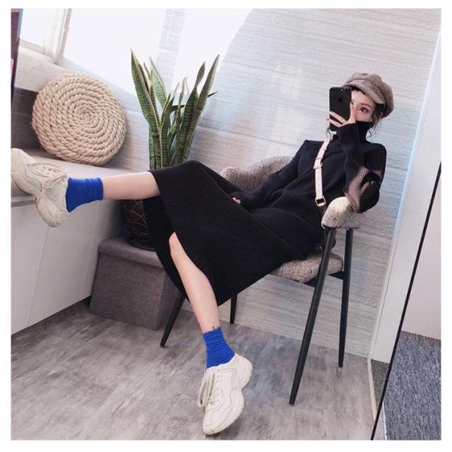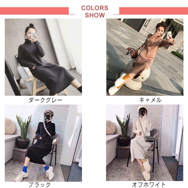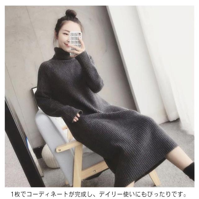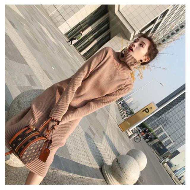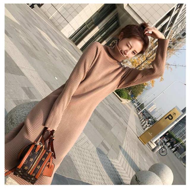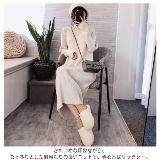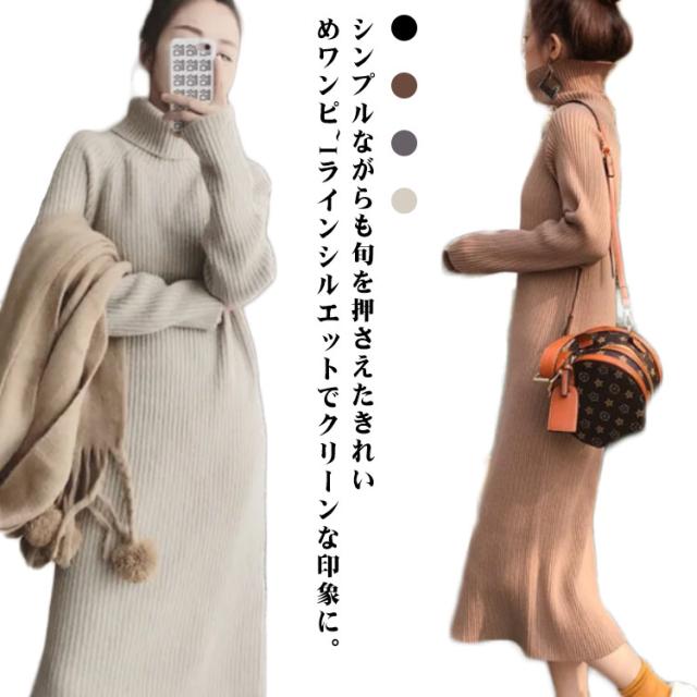 ボトルネック レディース 冬 秋 ひざ丈 ワンピース ハイネック ニット ニットワンピース ボトルネック ロングワンピース 無地 リブニット Iライン 大人 かわいい 体型カバー きれいめ 20代 30代