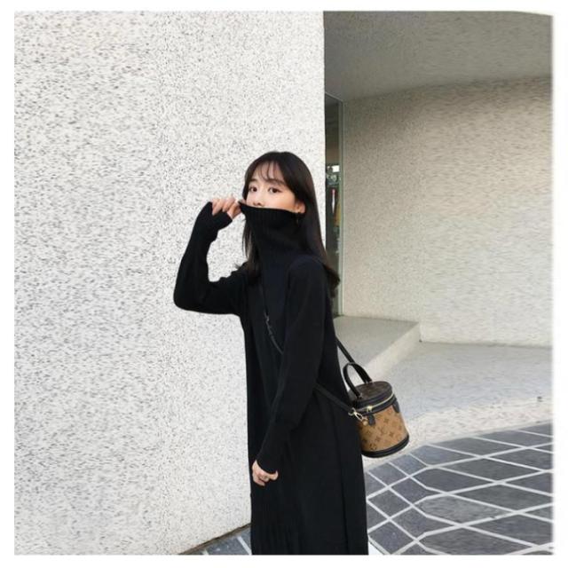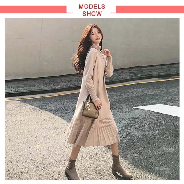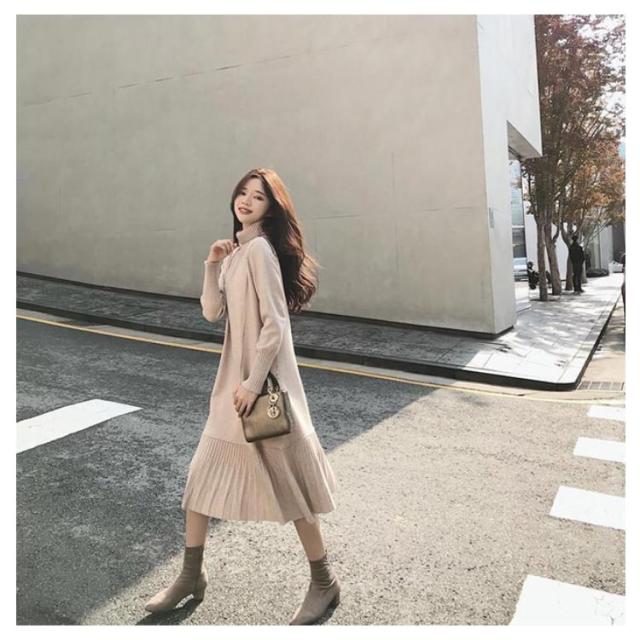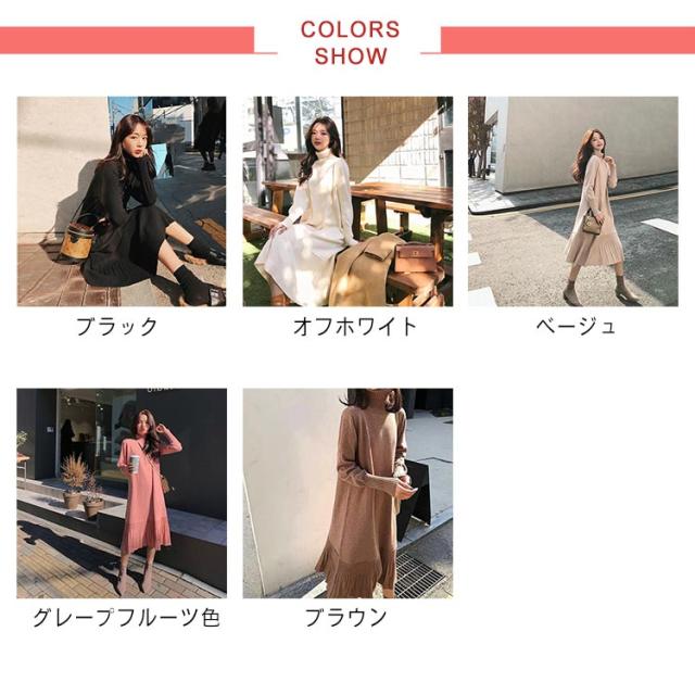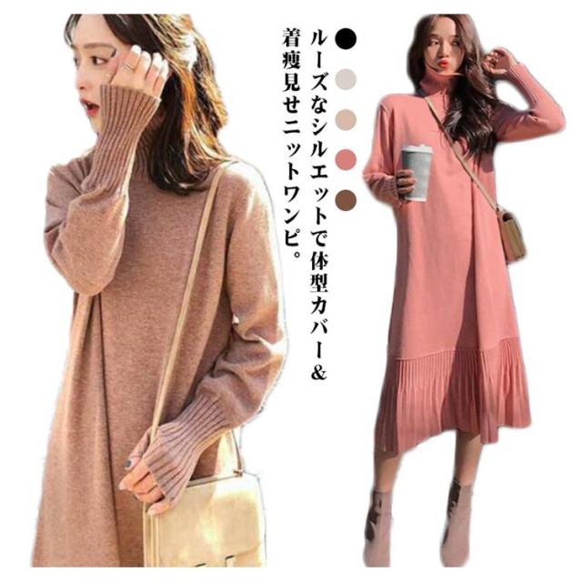 レディース きれいめ プリーツワンピース ワンピース 上品 秋冬 ニットワンピース 長袖 ニットワンピース 膝丈 切り替え 裾 ニット プリーツ ロング丈 ハイネック 大人カジュアル 体型カバー リブニット aライン 通勤 オフィス
