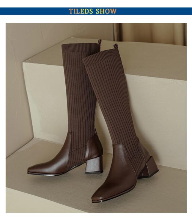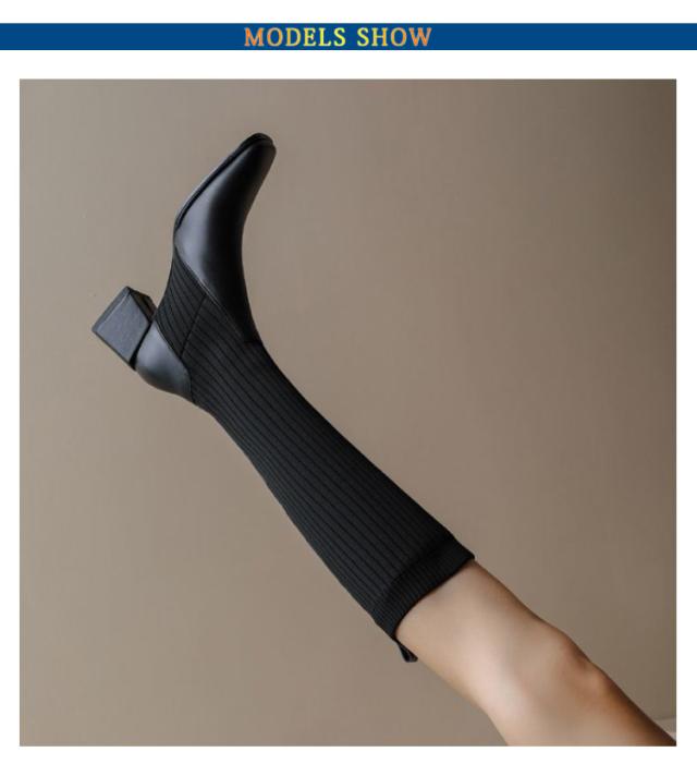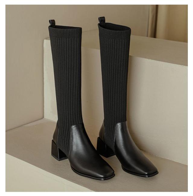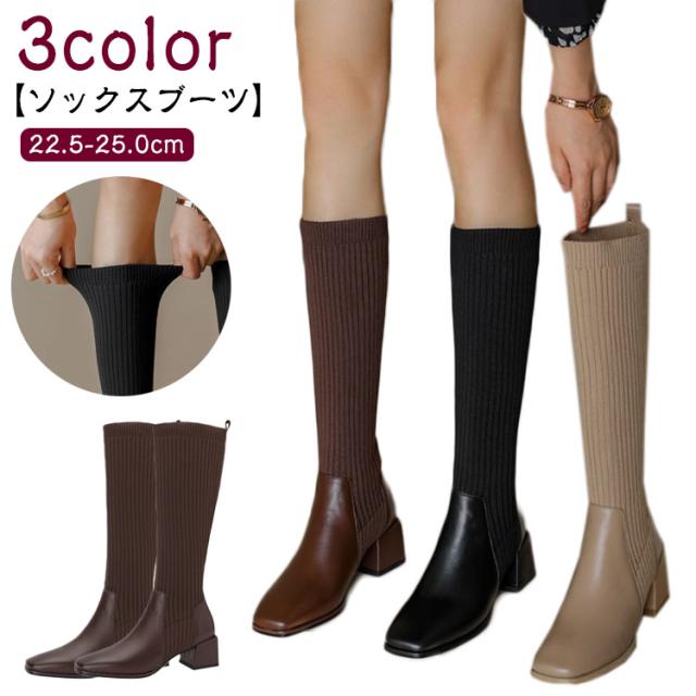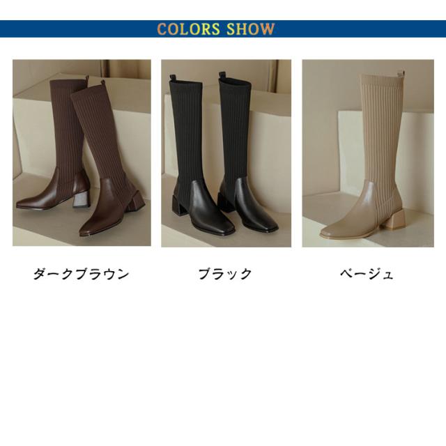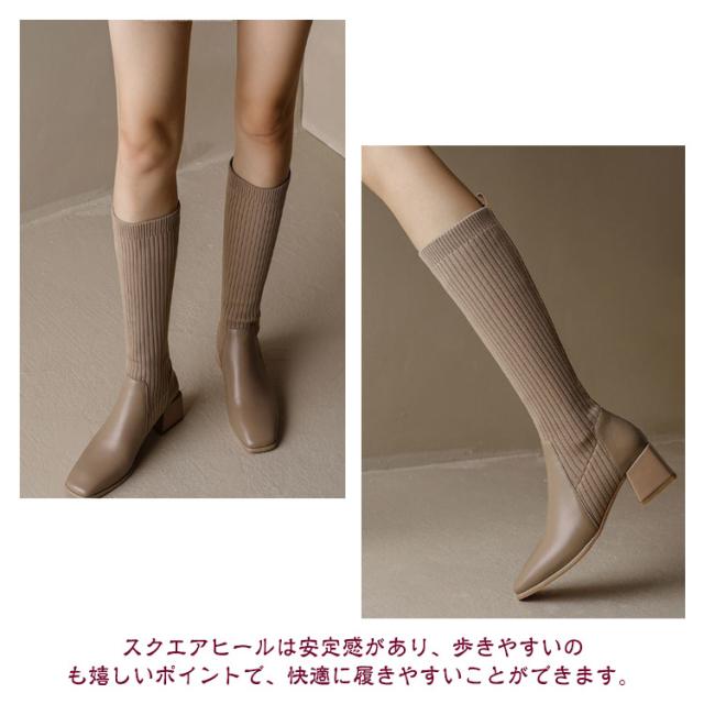 きれいめ 履きやすい ソックスブーツ 歩きやすい ストレッチ チャンキーヒール 黒 ストレッチブーツ ロングブーツ ロング 秋冬 レディース ブラック ニット ブーツ スクエアトゥ 太ヒール 伸縮性 痛くない 上品 美脚 おしゃれ