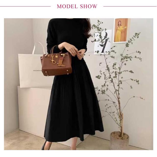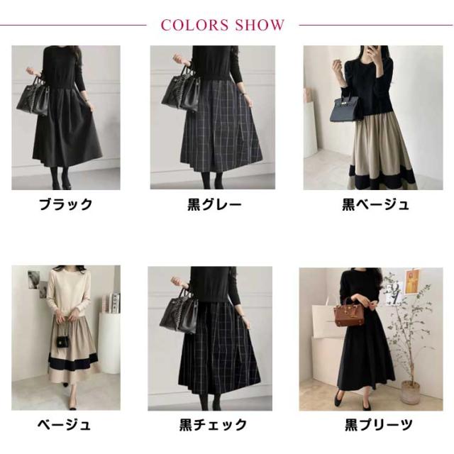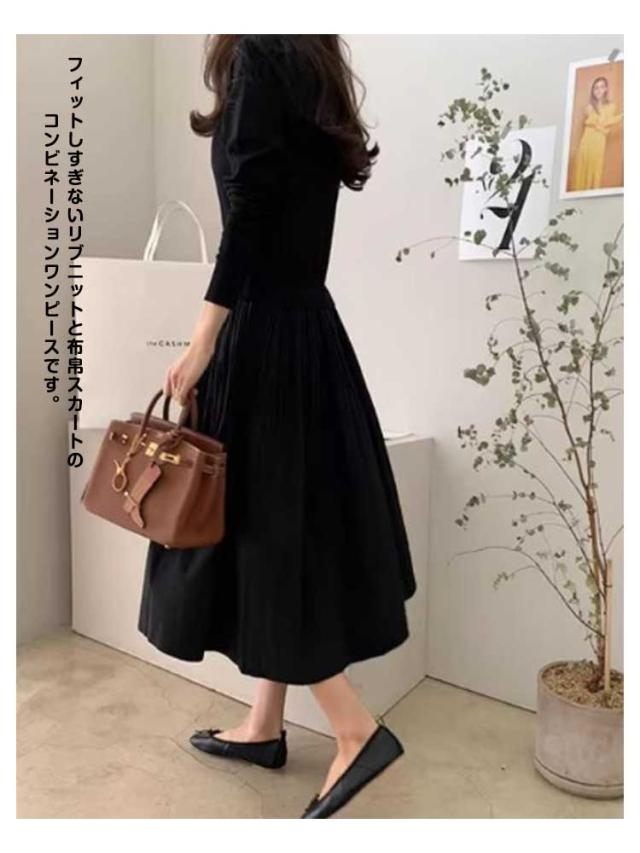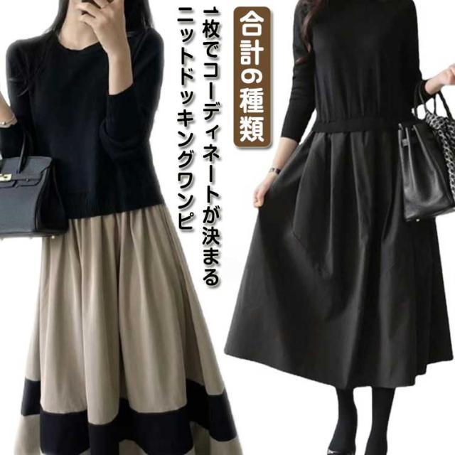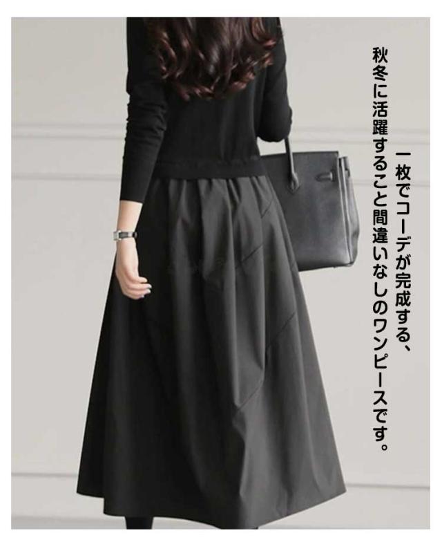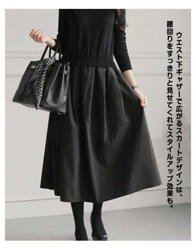 きれいめ ブラック ドッキングワンピース 異素材 フォーマル 配色 ロングワンピース 黒 上品 切り替え 体型カバー 長袖 クルーネック 丸首 ニットワンピース ロング丈 通勤 オフィスカジュアル 秋
