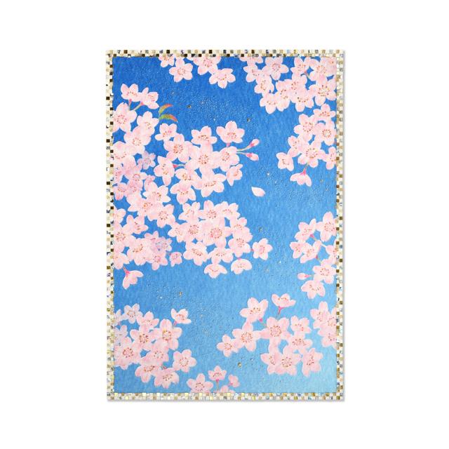 華やかな桜の風景を、パールのシルクスクリーン印刷や、金箔、ホログラム箔を使用して表現しました。