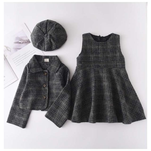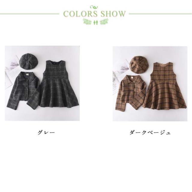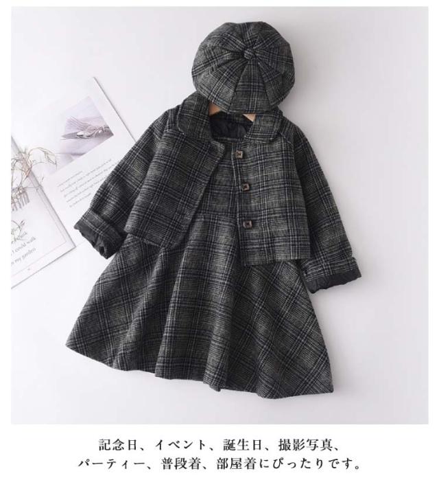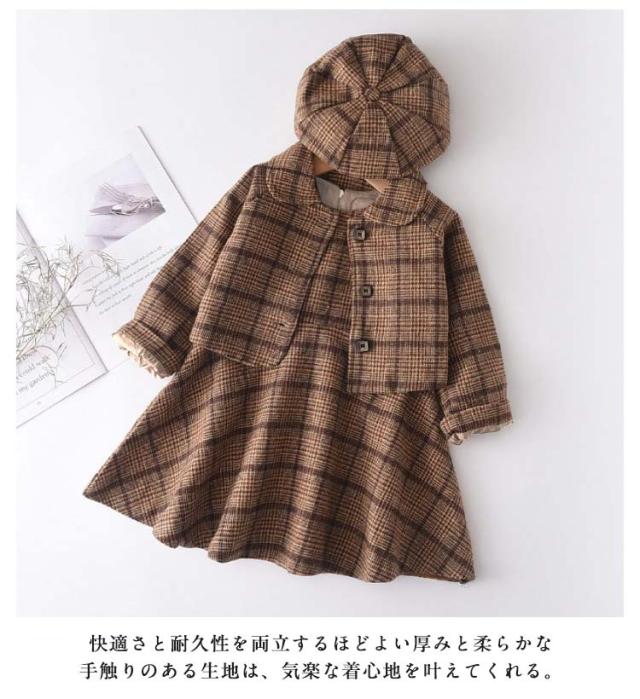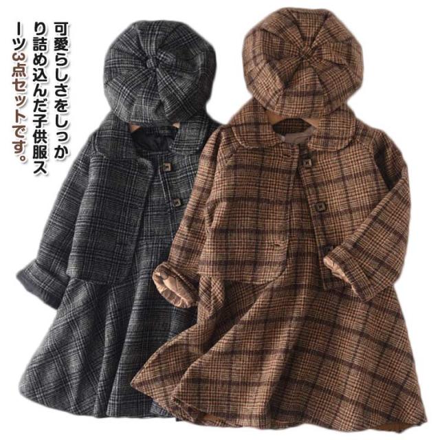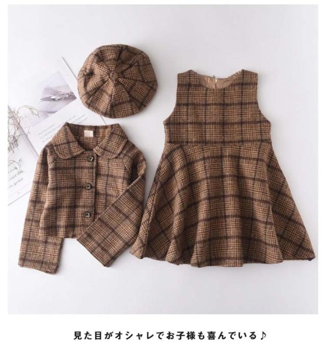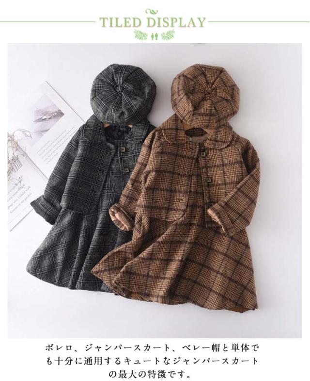 子供スーツ フォーマルスーツ コート 入学式 3点セット チェック柄 子供スーツ ジャンパースカート 女の子 ベレー帽付き スーツ 厚手 あったか ボレロ アウター ワンピース 普段着用 記念日 おしゃれ 卒園式