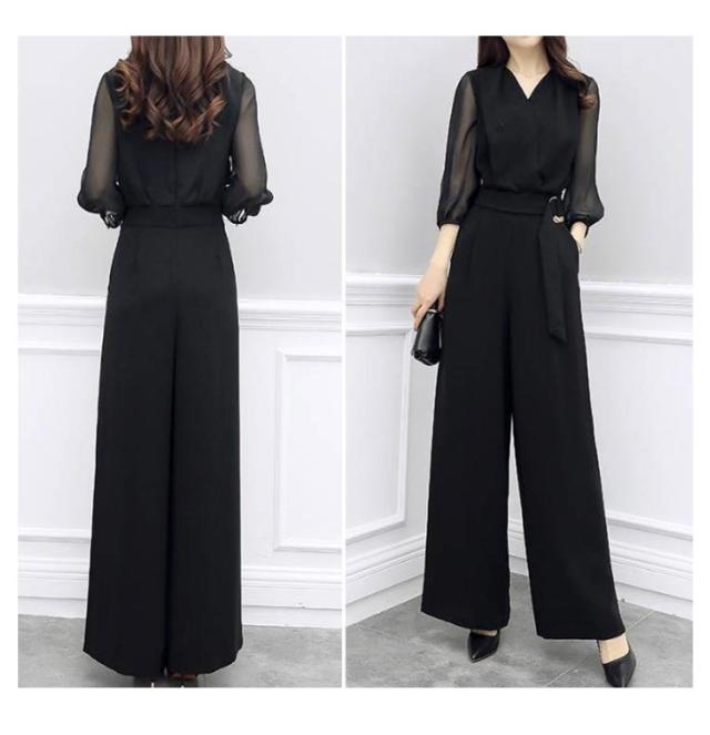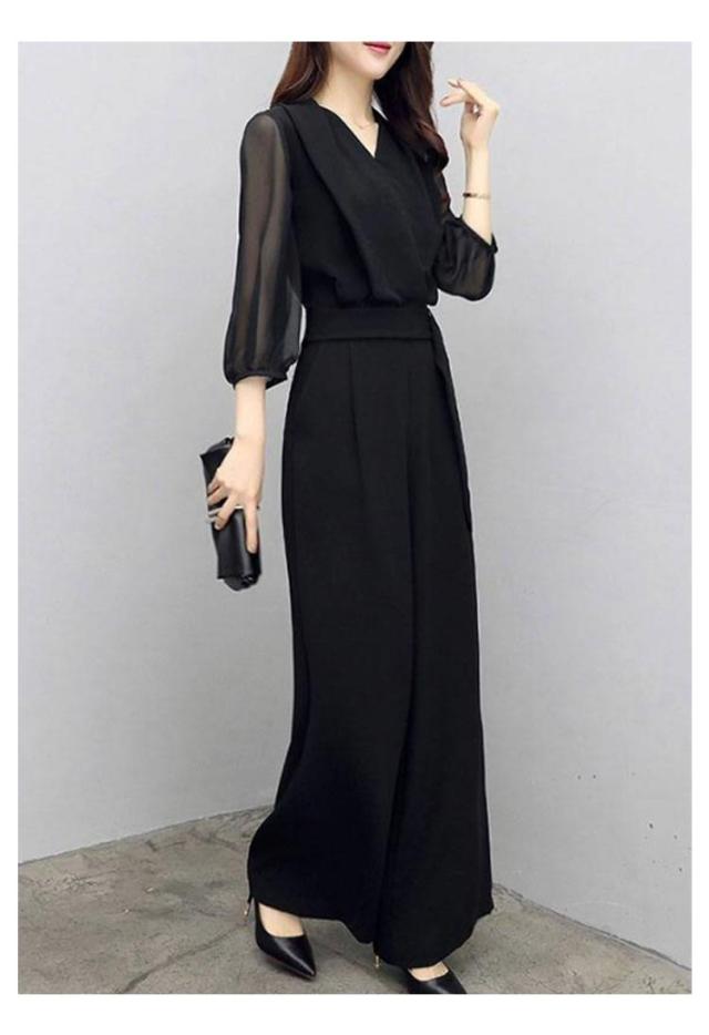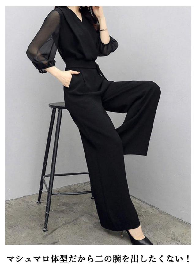 | Aラインシルエットパンツスーツ。 マシュマロ体型だから二の腕を出したくない! ブラックカラーのシックなオールインワン♪ シースルーの袖がセクシーな印象に☆ お呼ばれやフォーマルスタイルに◎ 同素材のベルトを、実際のウエストより高い位置に置くことで、低身長さんやマシュマロさんなどどんなサイズ感の人でもスタイリッシュに決まります。 | |