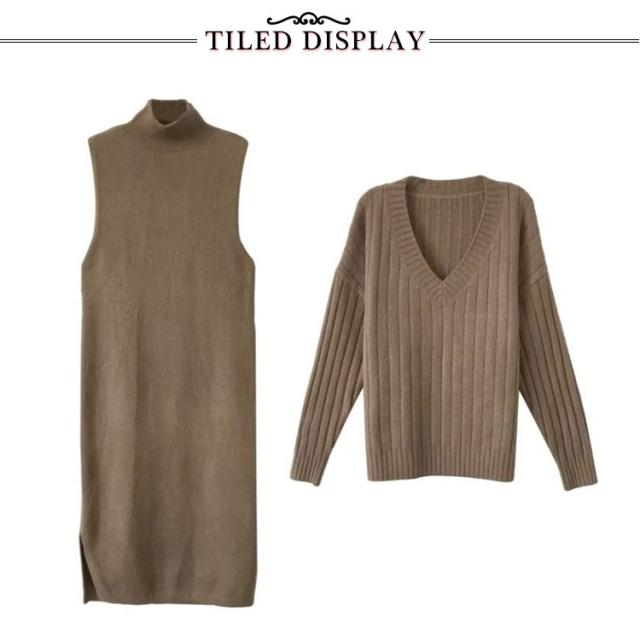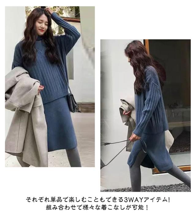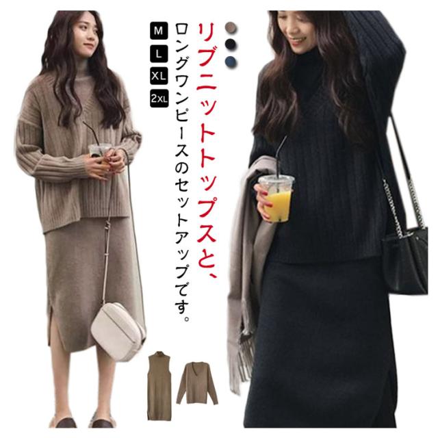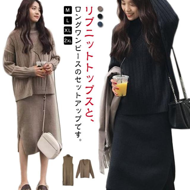 ロング ニットワンピース ノースリーブ リブニット ニットワンピース セットアップ 大きいサイズ ロングワンピース ワンピース ニットセーター ニットワンピース セーター タートルネック Vネック 長袖 秋 冬 ブラウン ブルー