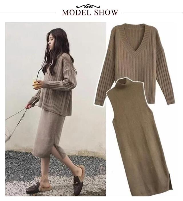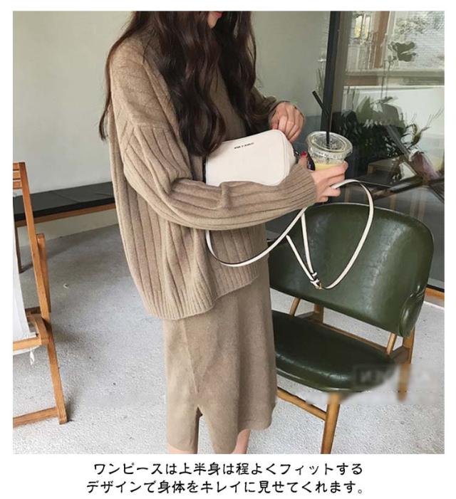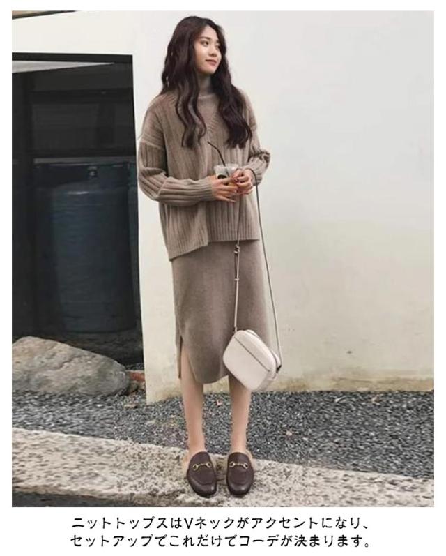 | リブニットトップスと、ロングワンピースのセットアップです。 ニットトップスはVネックがアクセントになり、セットアップでこれだけでコーデが決まります。 ワンピースは上半身は程よくフィットするデザインで身体をキレイに見せてくれます。 重ね着することで、シンプルに見えるワンピーススタイルをオシャレに見せてくれます。 それぞれ単品で楽しむこともできる3WAYアイテム! 組み合わせで様々な着こなしが可能! | |