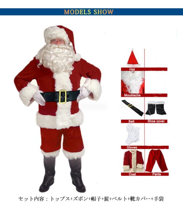 クリスマス 大人用 コスチューム 7点セット 送料無料 豪華 衣装 イベント サンタ メンズ コスプレ 仮装 クリスマス衣装 サンタ帽子 変身 パーティー 髭 男性 サンタコス ブーツカバー 送料無料 ヒゲ 袋 コスプレ衣装 長袖 サンタ服