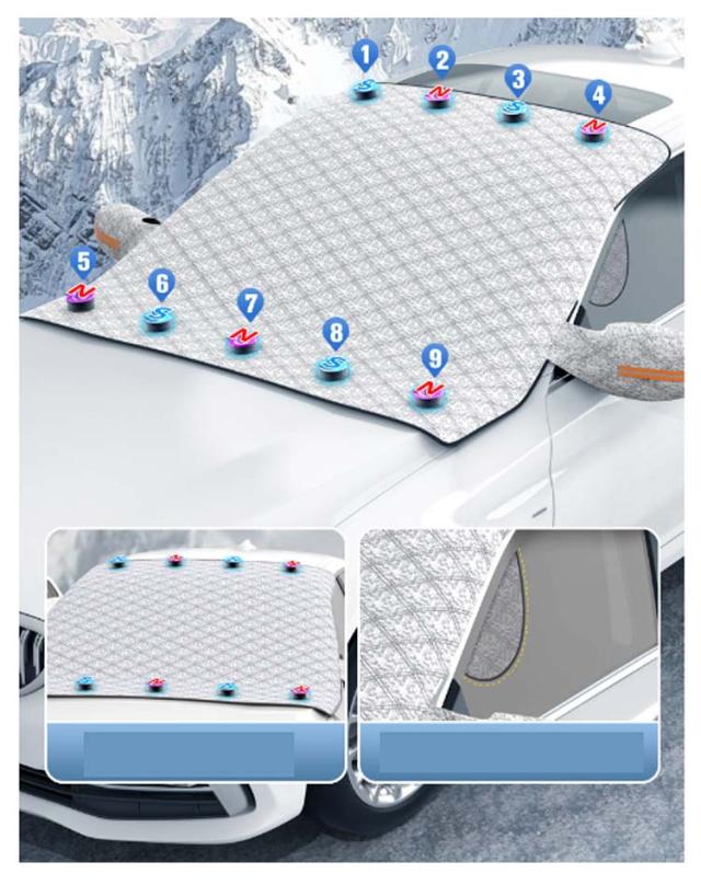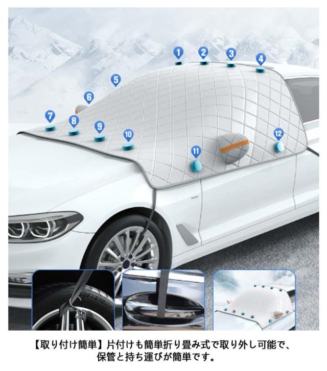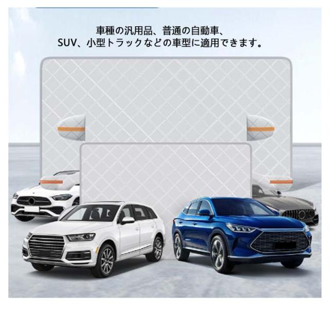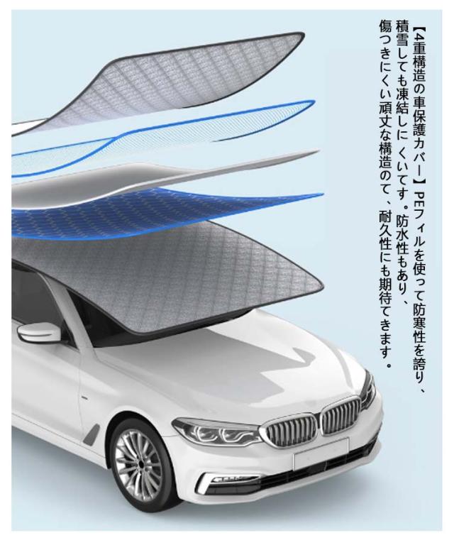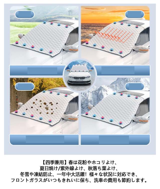 | フロントガラスカバー フックタイプ。車種の汎用品、普通の自動車、SUV、小型トラックなどの車型に適用できます。 【四季兼用】春は花粉やホコリよけ、夏日焼け/紫外線よけ、秋落ち葉よけ、冬雪や凍結防止、一年中大活躍!様々な状況に対応でき、フロントガラスがいつもきれいに保ち、洗車の費用も節約します。 【取り付け簡単】片付けも簡単折り畳み式で取り外し可能で、保管と持ち運びが簡単です。 【4重構造の車保護カバー】PEフィルを使って防寒性を誇り、積雪しても凍結しに くいてす。防水性もあり、傷つきにくい頑丈な構造のて、耐久性にも期待てきます。 【時間・エネルギーを節約可能】冬朝に氷/雪/その他のものを片付けるのにかかる時間、夏/冬エアコンの電源を入れるの時間と燃料を短縮できます。 | |