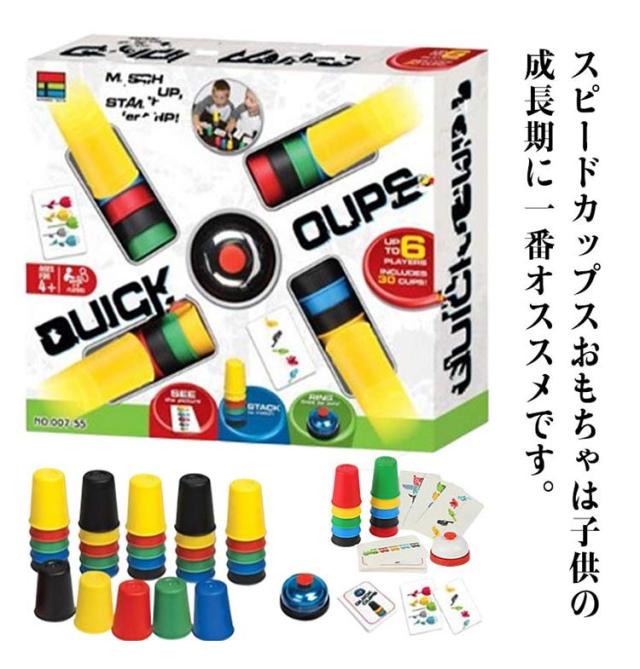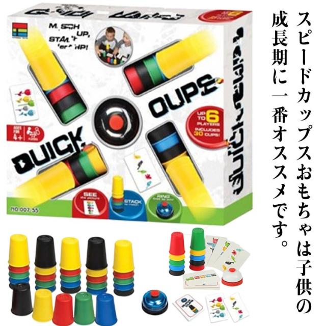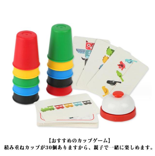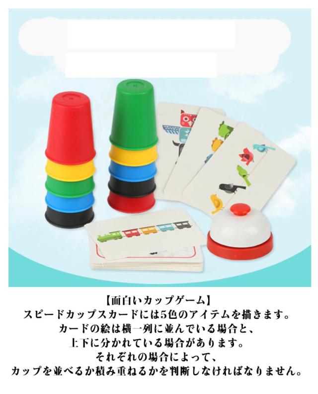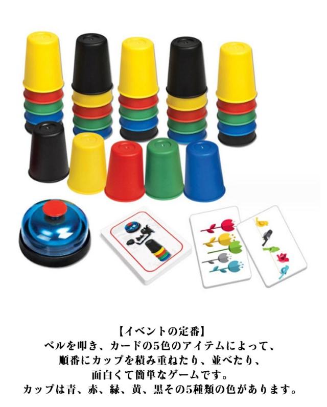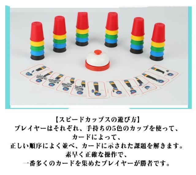 | スピードカップスおもちゃは子供の成長期に一番オススメです。 【イベントの定番】ベルを叩き、カードの5色のアイテムによって、順番にカップを積み重ねたり、並べたり、面白くて簡単なゲームです。カップは青、赤、緑、黄、黒その5種類の色があります。 【スピードカップスの遊び方】プレイヤーはそれぞれ、手持ちの5色のカップを使って、カードによって、正しい順序によく並べ、カードに示された課題を解きます。素早く正確な操作で、一番多くのカードを集めたプレイヤーが勝者です。 【面白いカップゲーム】スピードカップスカードには5色のアイテムを描きます。カードの絵は横一列に並んでいる場合と、上下に分かれている場合があります。それぞれの場合によって、カップを並べるか積み重ねるかを判断しなければなりません。 【おすすめのカップゲーム】積み重ねカップが30個ありますから、親子で一緒に楽しめます。 | |