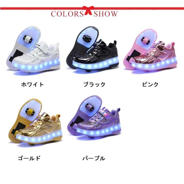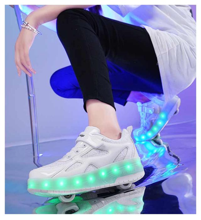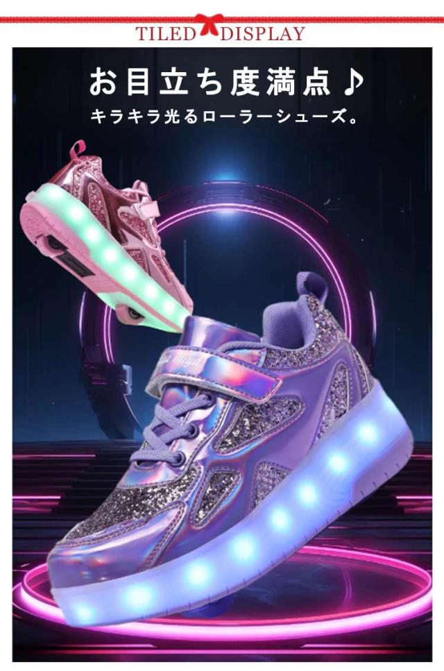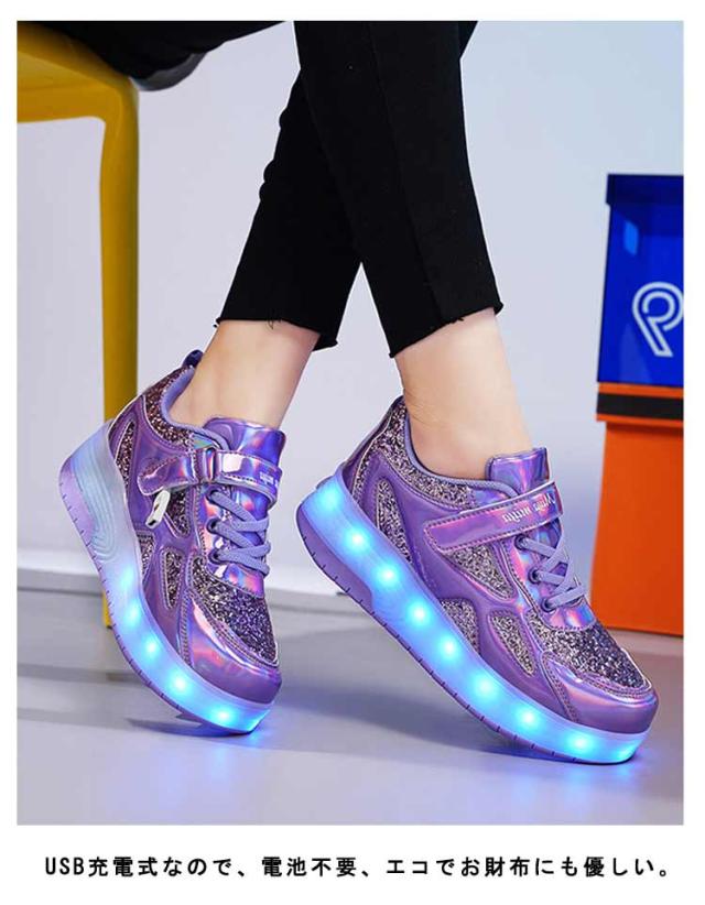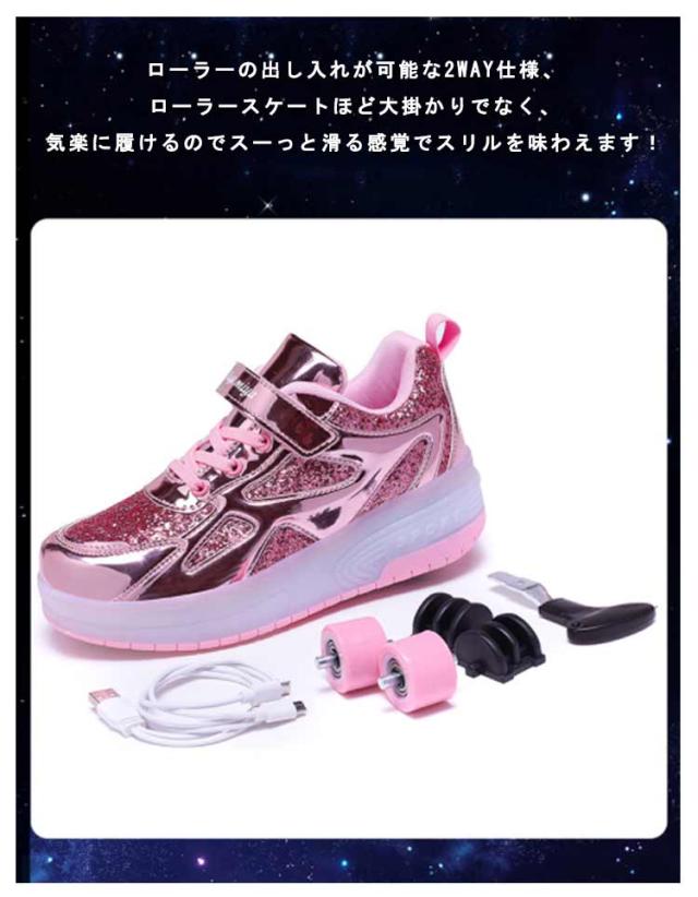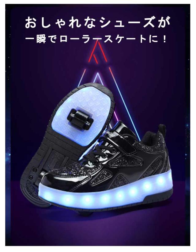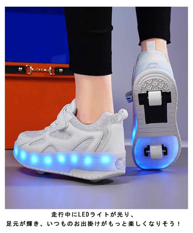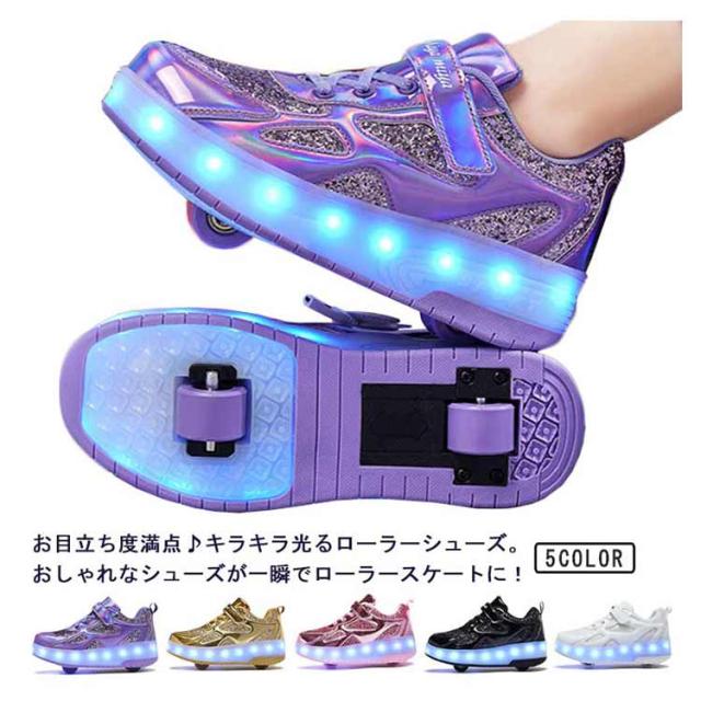 | お目立ち度満点♪キラキラ光るローラーシューズ。 おしゃれなシューズが一瞬でローラースケートに! ローラーの出し入れが可能な2WAY仕様、ローラースケートほど大掛かりでなく、気楽に履けるのでスーっと滑る感覚でスリルを味わえます! 前輪が補助輪となる2輪式ので、初心者でも乗りやすい クッション性の高いTPRソールを採用し、ローラーをしまえばスニーカーとしても快適。通学はもちろんのこと、おでかけ用としても活躍してくれます。 USB充電式なので、電池不要、エコでお財布にも優しい。 走行中にledライトが光り、足元が輝き、いつものお出掛けがもっと楽しくなりそう! | |