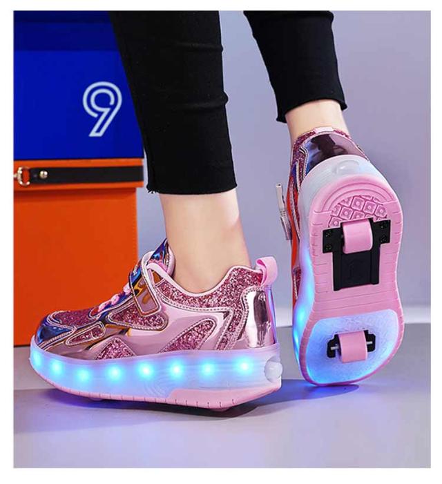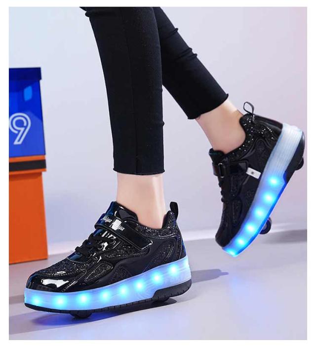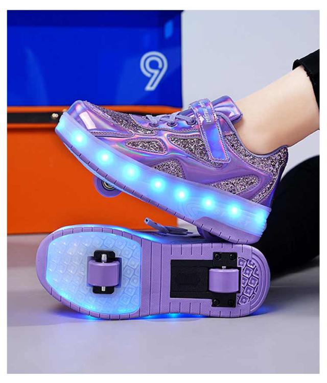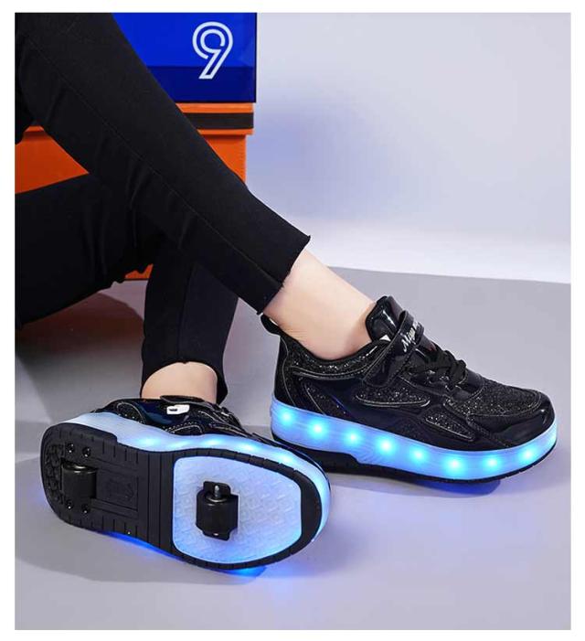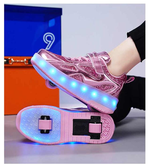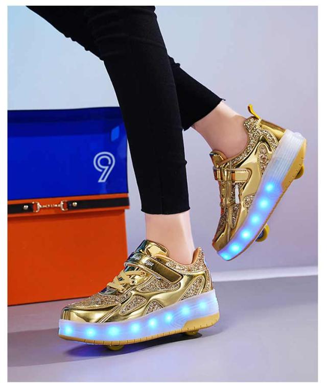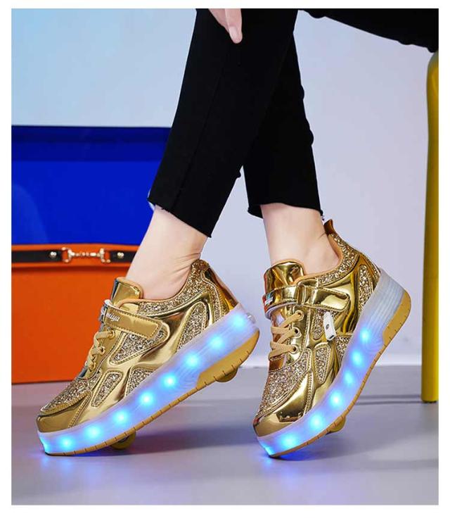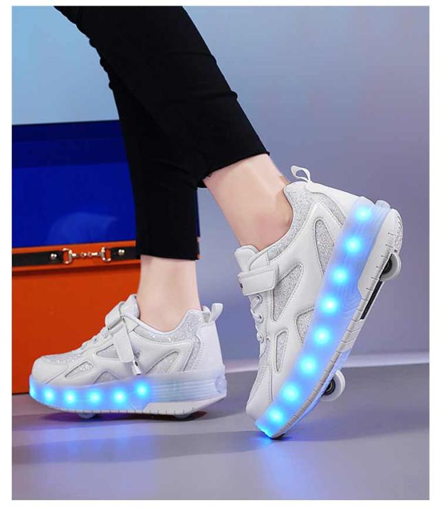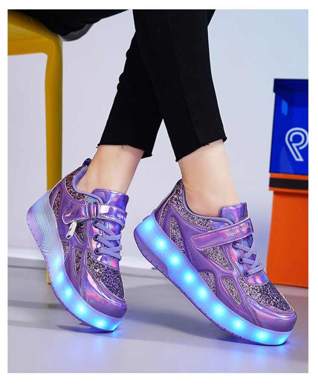| お目立ち度満点♪キラキラ光るローラーシューズ。 おしゃれなシューズが一瞬でローラースケートに! ローラーの出し入れが可能な2WAY仕様、ローラースケートほど大掛かりでなく、気楽に履けるのでスーっと滑る感覚でスリルを味わえます! 前輪が補助輪となる2輪式ので、初心者でも乗りやすい クッション性の高いTPRソールを採用し、ローラーをしまえばスニーカーとしても快適。通学はもちろんのこと、おでかけ用としても活躍してくれます。 USB充電式なので、電池不要、エコでお財布にも優しい。 走行中にledライトが光り、足元が輝き、いつものお出掛けがもっと楽しくなりそう! | |
