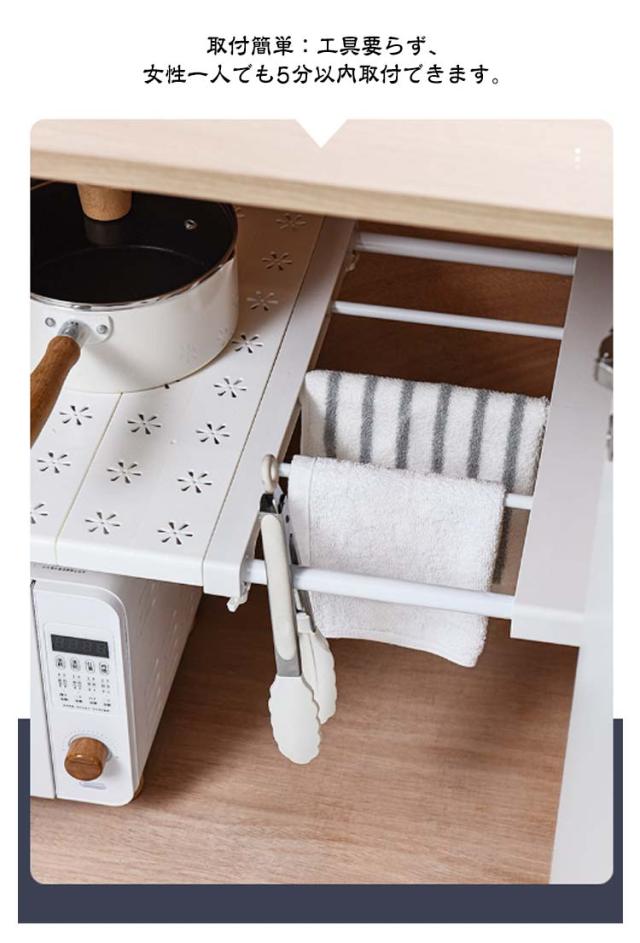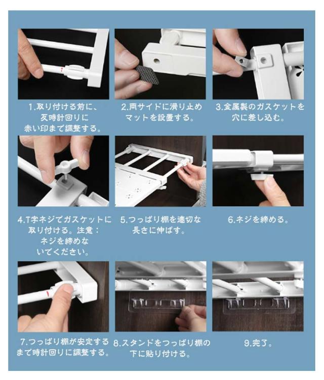 | 【10サイズ展開】【伸縮つっぱり棚】 クローゼット衣類収納、玄関、キッチン食器収納、浴室・洗面所収納棚、ランドリーラック、本棚などマルチなシーンに活躍する。 【ポイント】 小物が置けるフラットな棚板が付いている ネジや釘を使わずに壁にしっかり固定できる 自由に幅を調整できる 取付簡単:工具要らず、女性一人でも5分以内取付できます。 1.取り付ける前に、反時計回りに赤い印まで調整する。 2.両サイドに滑り止めマットを設置する。 3.金属製のガスケットを穴に差し込む。 4.T字ネジでガスケットに取り付ける。注意:ネジを締めないでください。 5.つっぱり棚を適切な長さに伸ばす。 6.ネジを締める。 7.つっぱり棚が安定するまで時計回りに調整する。 8.スタンドをつっぱり棚の下に貼り付ける。 9.完了。 | |