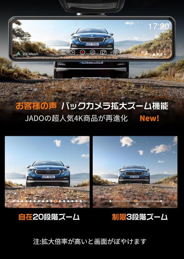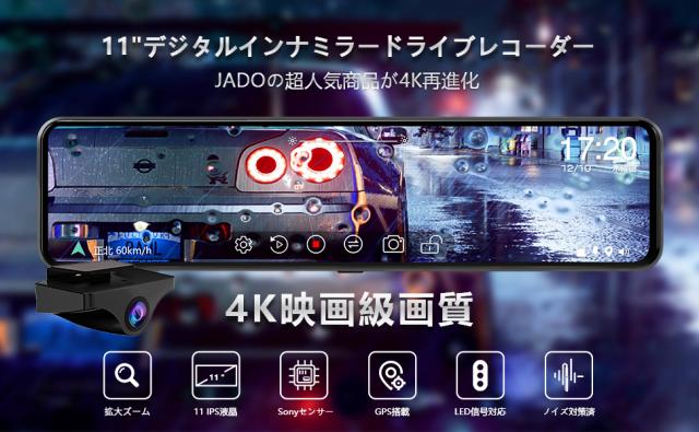 JADO ドライブレコーダー ミラー型 4K 高画質 デジタルカメラ 前後カメラ ドラレコ GPS WDR HDR 超鮮明夜間暗視 バックカメラ デジタルインナーミラー 本体再生 防水 LED信号 地デジ対策 24時間駐車監視 タイムラプス11インチ タッチ式 G810+