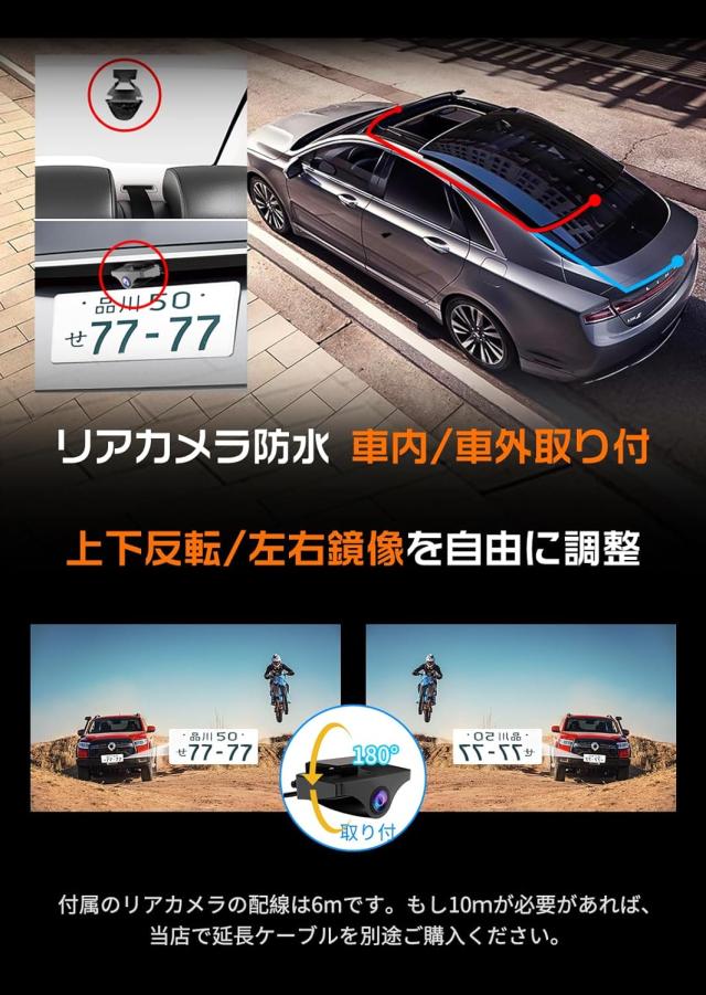 ●【防水リアカメラ上下反転&取り付簡単&電波障害対策】バックカメラは防水で、車内・車外ともに使用可能で、 ?取付キット付属です。後ろ録画を上下反転させることができるので、リアカメラを180°反転させることができるので設置が簡単です。リア配線6m付属、ルーフ配線なら普通の車種で6mあれば十分、10mケーブルが必要な場合は、弊社延長ケーブルを別途お求めくださいます。ドラレコ本体やケーブルなどにノイズ対策が施され、電磁波が外部環境への漏洩を防ぐための対策も行なってカーナビ、地デジ等に影響を及ぼさないようにしています。注:増設したカーナビは対策が不十分なため、干渉する場合があります。??10M延長コード「別売B08JHXYJT1」 ●【駐車監視機能「タイムラプス」&GPS多機能サポート】高規格のスーパーキャパシタ設計を採用し、バッテリーを内蔵せず、耐久性と耐熱性を高めました。専用降圧ケーブル「別売B09L12BB8M」を利用し、駐車エンジンが停止した場合、沖撃を受けると自働的に録画をオンにして緊急録画ファイルを入れます。「タイムラプス」機能は自働的に表示をオフにし、画面のフレームレートを圧縮して前後ノンストップで24H録画できます。GPS付属、自動訂正UTC時刻、車の速度計はより正確、運転軌跡位置情報を再生しを全部記録できます。注:降圧ケーブルを正しく取り付けると11.8~12Vを切ると自動的にオフになります。「バッテリー保護機能」