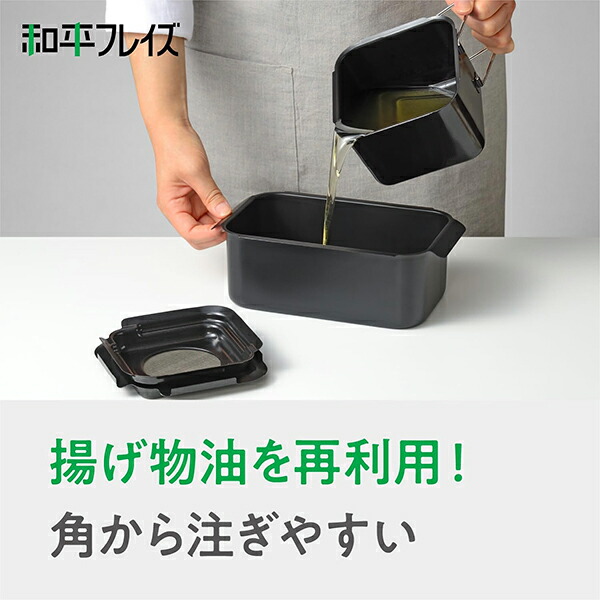 揚げ物に付き物なお悩みをポコフリがまるっと解決! ●スッキリ収納できる角型オイルポット ●お手入れしやすいふっ素樹脂加工! 1.揚げ鍋と並べてスッキリ収納 2.角から注げる(収納時は蓋を90度回転) 3.蓋の裏にこしアミが置ける