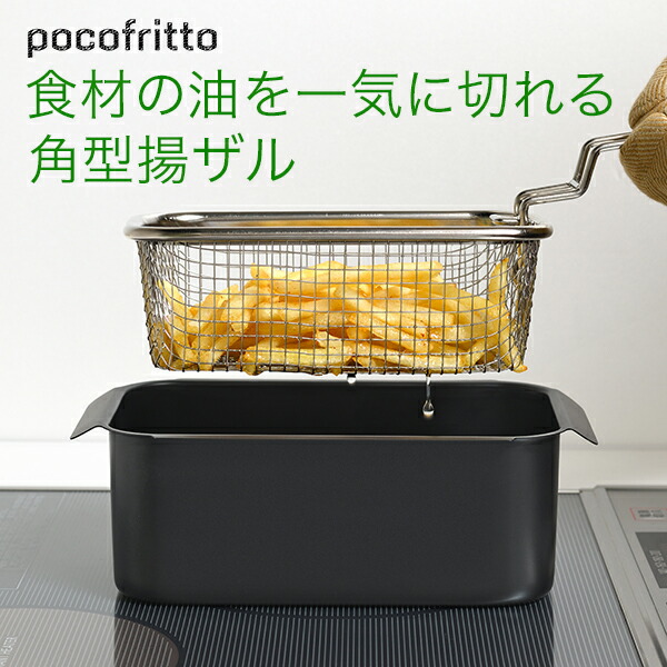 揚げ物に付き物なお悩みをポコフリがまるっと解決! ●食材の油を一気に切れる角型揚ザル 1.つかみにくいポテトも一気に油切り 2.からあげの二度揚げにも 3.取っ手が折りたためてコンパクトに収納
