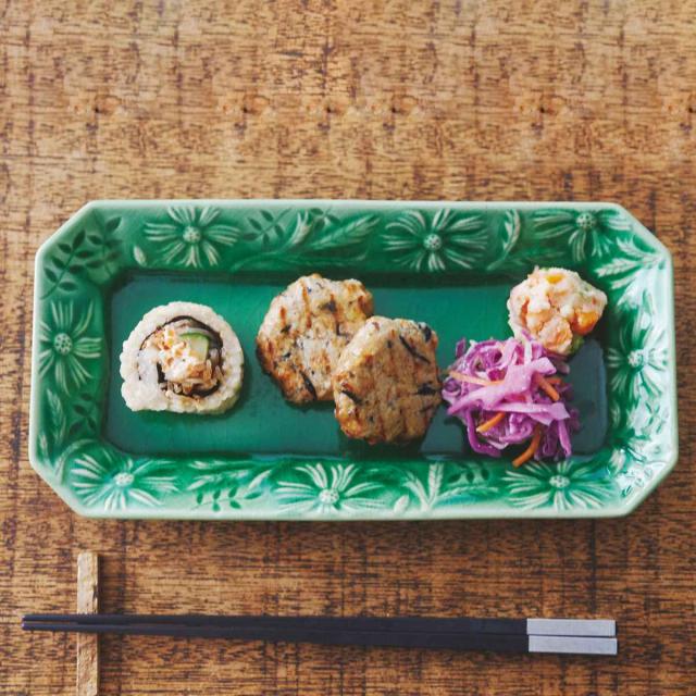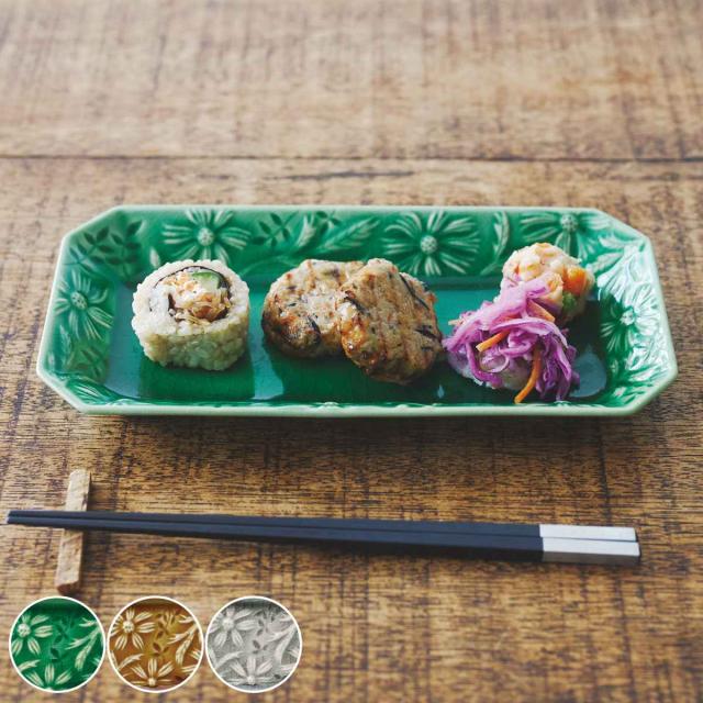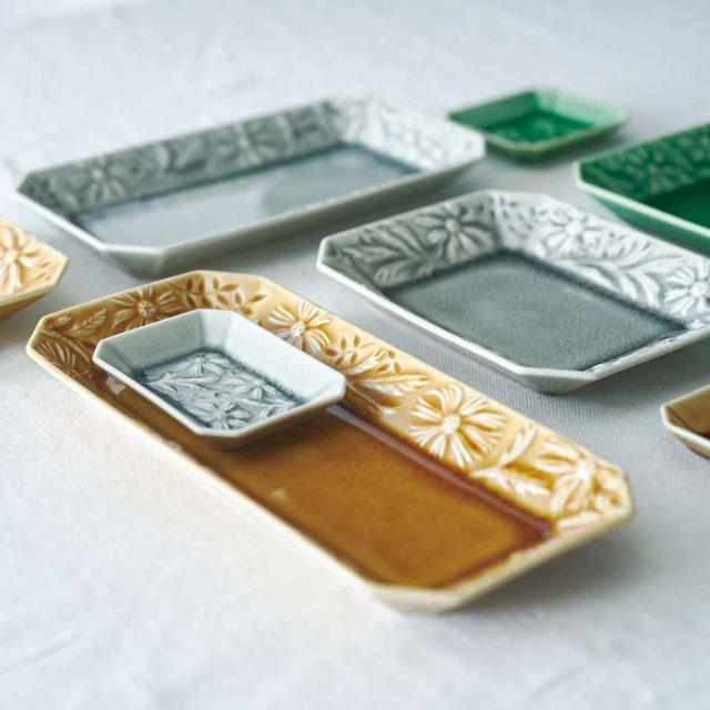 冬から春にかけて花を咲かせるマーガレットの花をモチーフにしたシリーズの角皿です。マーガレットのレリーフと美しい貫入の釉(うわぐすり)で品よく洗練された雰囲気があります。また、落ち着いた色合いなので幅広いお料理や食卓の雰囲気に対応します。長皿24cmは縁が立ち上がった形状で、深さがあるので高さをつけて盛り付けしても様になります。唐揚げとサラダなど2品盛りにしても収まりの良い形です。また食事だけでなくスイーツ皿にも適しています。