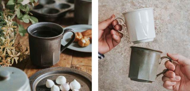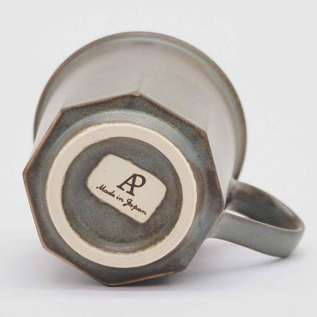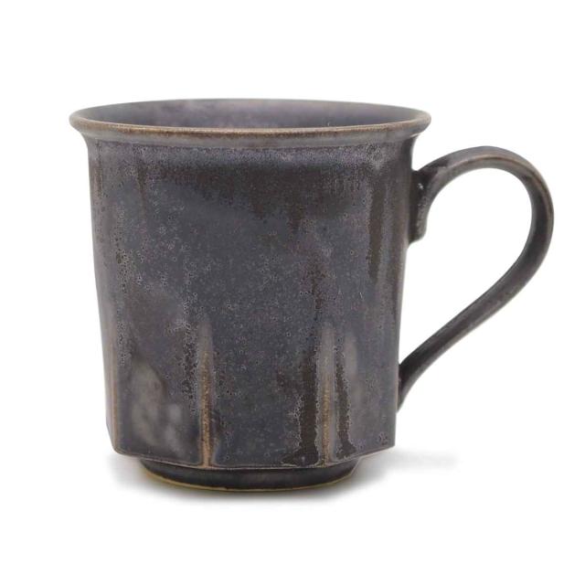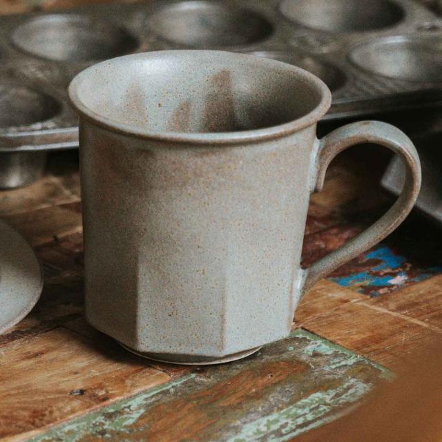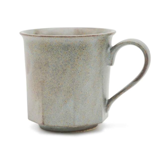 口元はフラット、ボトムは八角形のマグカップです。繊細なフォルムと異素材のような粗い釉薬のミスマッチがポイントです。軽量で持ちやすく実用性も高いマグカップです。