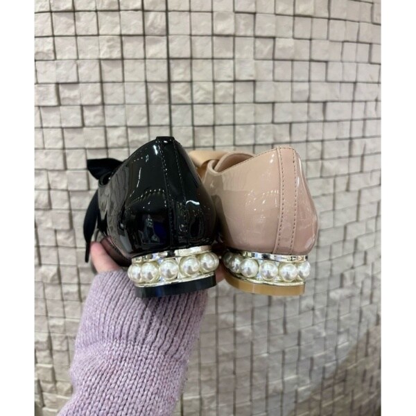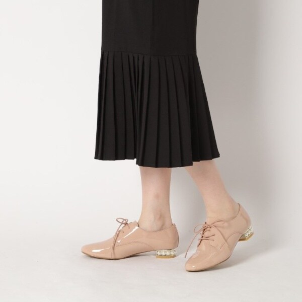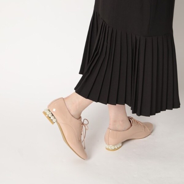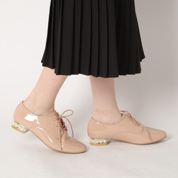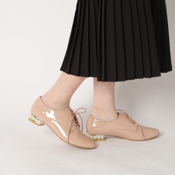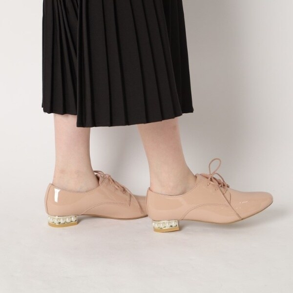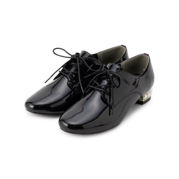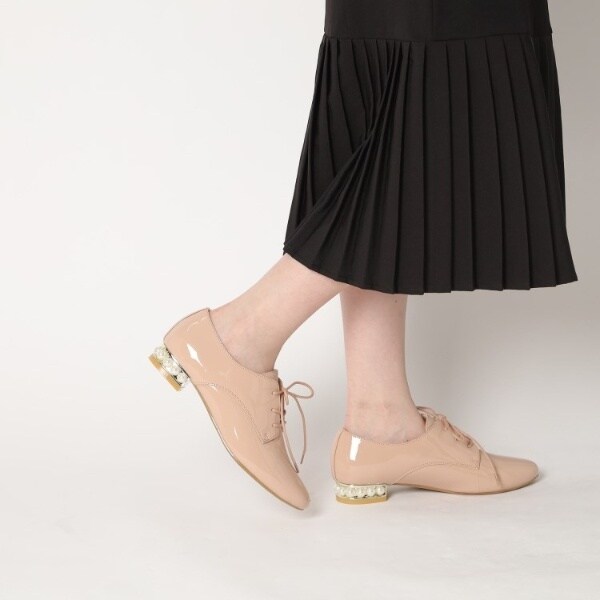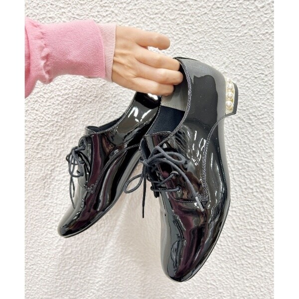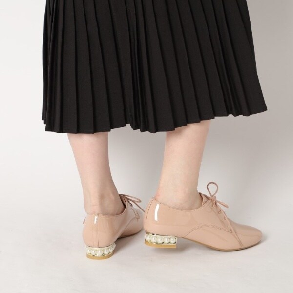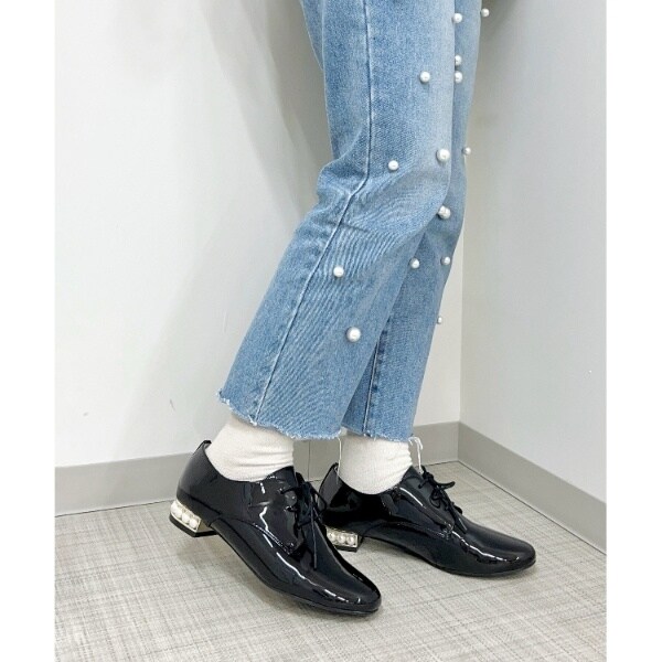 粒が大きめのフェイクパールがヒールにぐるりとあしらわれたマニッシュシューズ。