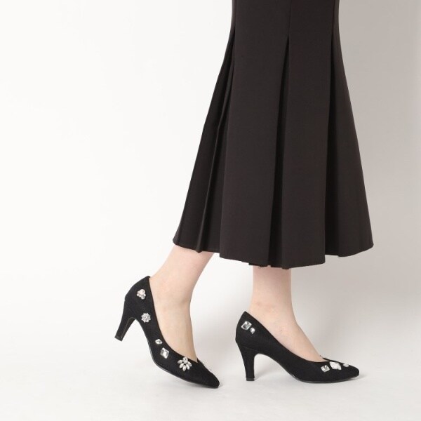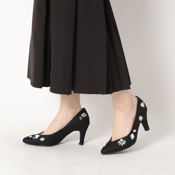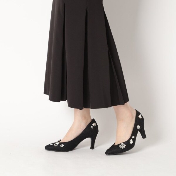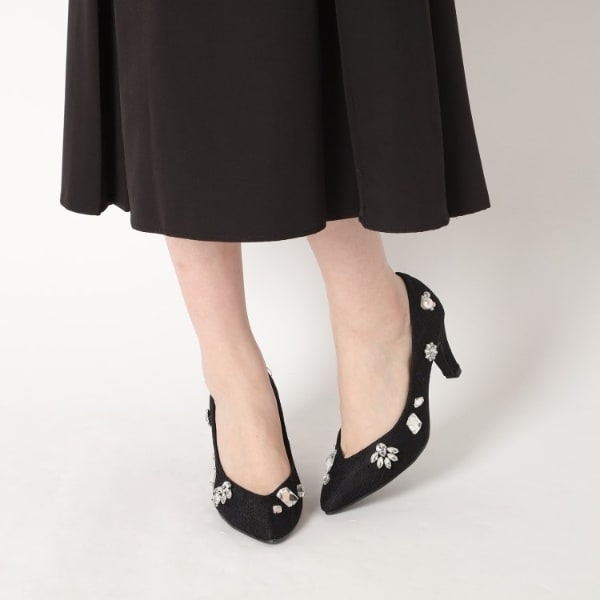 大粒のビジューを全体にあしらった靴が主役のパンプスです。