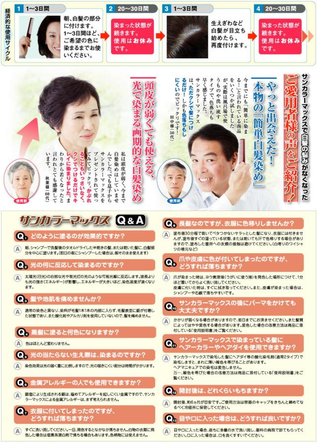 サンカラーマックスは銀塩の光還元反応を利用した全く新しい白髪ケアのための発色性ヘアクリームです。