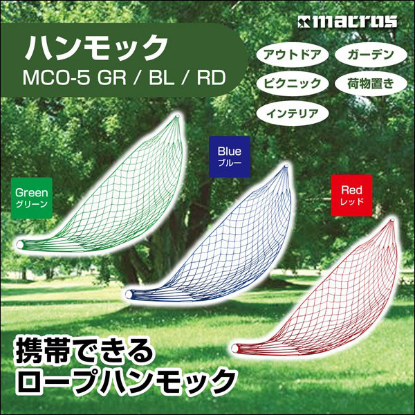 送料無料 携帯できるロープハンモック MCO-5x1本 お色お任せ発送 サイズの問題で箱を開封し畳んで発送となります。