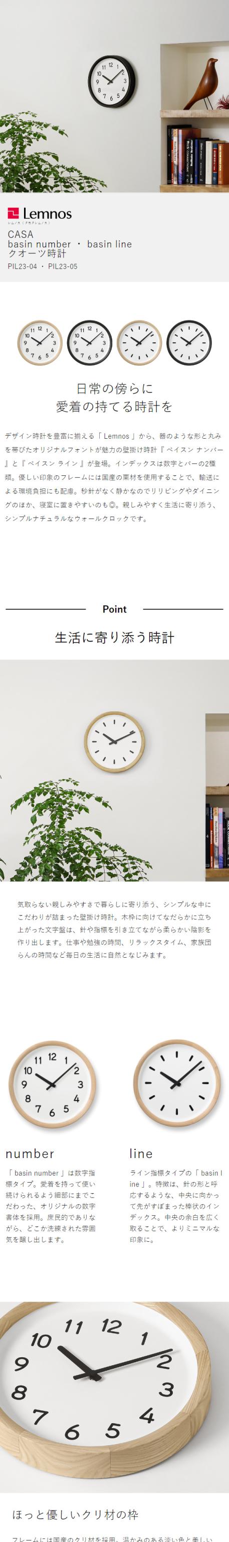 デザイン時計を豊富に揃える「 Lemnos 」から、器のような形と丸みを帯びたオリジナルフォントが魅力の壁掛け時計『 ベイスン ナンバー 』と『 ベイスン ライン 』が登場。インデックスは数字とバーの2種類。優しい印象のフレームには国産の栗材を使用することで、輸送による環境負担にも配慮。秒針がなく静かなのでリリビングやダイニングのほか、寝室に置きやすいのも◎。親しみやすく生活に寄り添う、シンプルナチュラルなウォールクロックです。